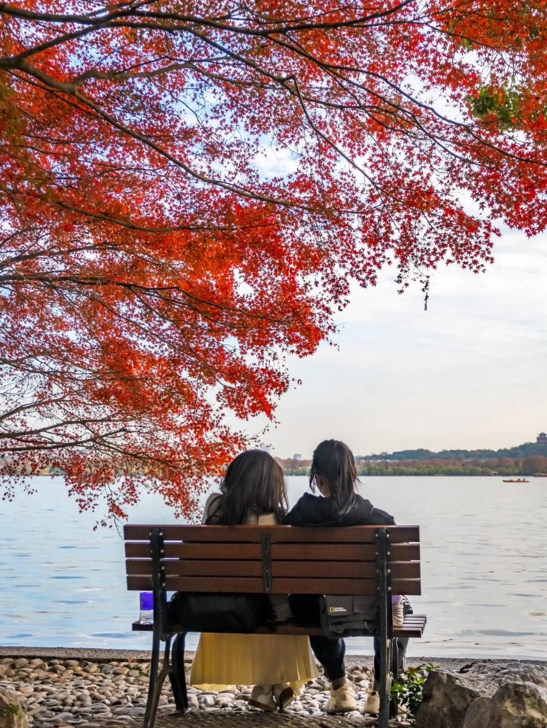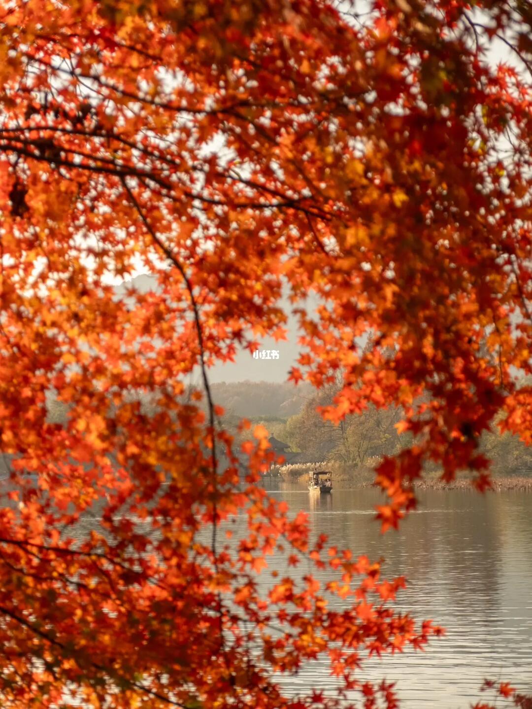 记得坐在湖岸边座椅上拍,阳光照到红枫上好美