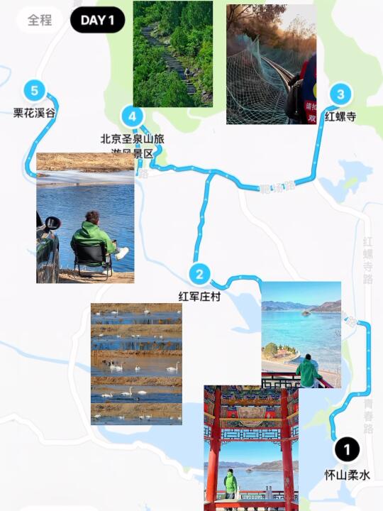 怀山柔水(看怀柔水库)👉红军庄村(看西伯利亚天鹅🦢)👉红螺寺(推荐)👉圣泉山(推荐徒步登山)👉栗花沟(推荐露营吃饭)