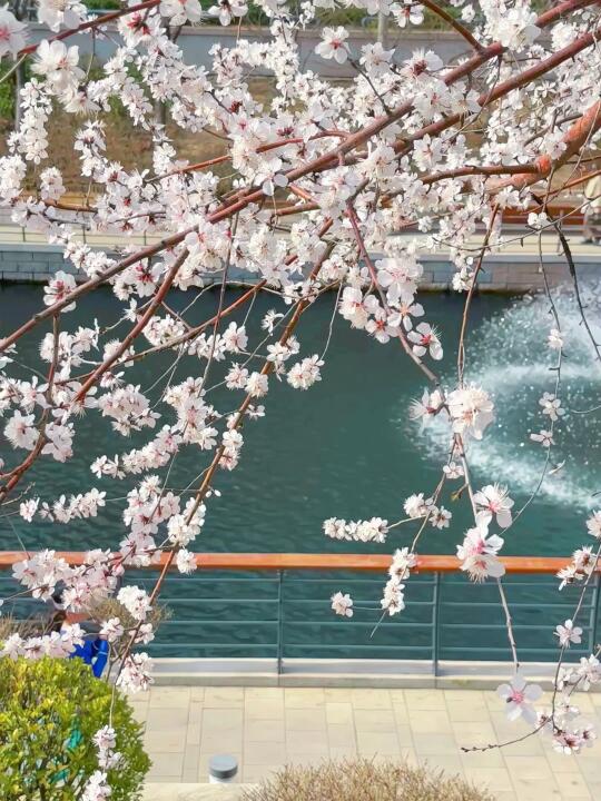 📸花枝开的比较好的找下垂的地方坐在河边,花一半溪水一半,也可以从对面拍,坐下