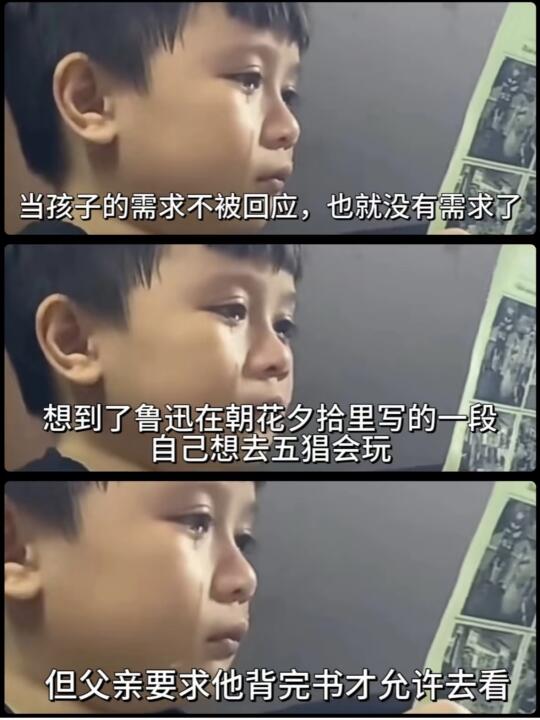 最近有一个让人心碎的片段:“一个小男孩,因为爸爸不允许他参加学校的郊游,静静地哭了一个小时。他没有大声抗议,只是默默地流泪。最后,爸爸心软了,同意他去。但那一刻,孩子的快乐已经被泪水冲淡,去与不去,似乎已无分别。”