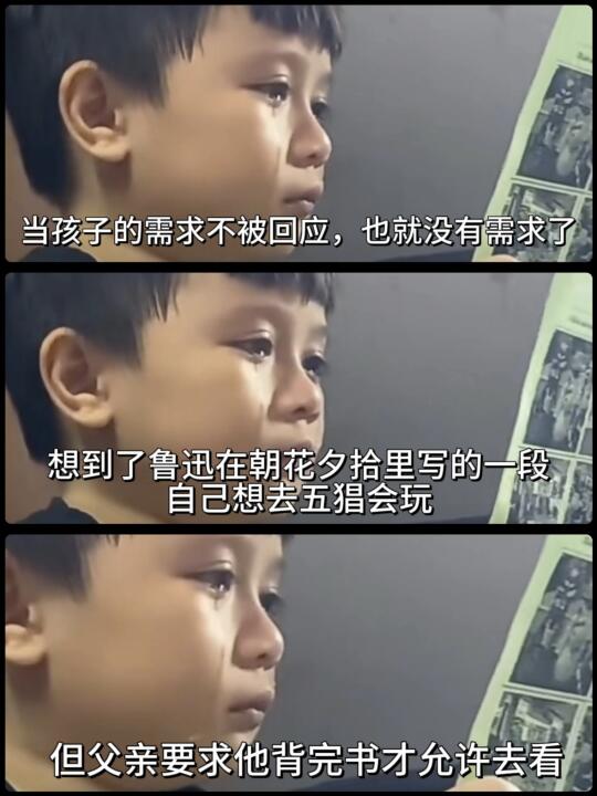最近有一个让人心碎的片段:“一个小男孩,因为爸爸不允许他参加学校的郊游,静静地哭了一个小时。他没有大声抗议,只是默默地流泪。最后,爸爸心软了,同意他去。但那一刻,孩子的快乐已经被泪水冲淡,去与不去,似乎已无分别。” · 明明可以开心去玩,但偏偏要哭一顿才让去,爸爸并非发自内心想让孩子快乐,此时,去不去已经没有太大区别了。 · 孩子那一瞬间的失落,撕开了多人内心深处的隐痛呢?让我的心也跟着沉了下去 · 这让我想起了鲁迅先生的《朝花夕拾》。 文中写道: “我似乎从头上浇了一盆冷水” 但是,有什么法子呢?自然是读着,读着,强记着,在梦似的就背完了。 “不错。去罢。”父亲点着头,说。 大家同时活动起来,脸上都露出笑容,向河埠走去。工人将我高高地抱起,仿佛在祝贺我的成功一般,快步走在最前头。 我却并没有他们那么高兴。开船以后,水路中的风景,盒子里的点心,以及到了东关的五猖会的热闹,对于我似乎都没有什么大意思。 · 他描述了自己儿时对节日的渴望,却被父亲要求背书才能去玩。尽管他最终背完了书,但那份期待和快乐已经消失,那份被冷水浇灭的热情,那份最终的失望,兴致也没有了,只有少年那无法弥补的遗憾。 · 有时候,我们的孩子,他们的需求真的过分吗?他们只是想要去玩,只是想要去探索世界,去感受生活的美好。 让他们觉得只有表现出足够的悲伤,才能得到想要的东西。 我想我们的孩子,不应该在泪水中学会如何获得爱和重视。 · 又或者是习惯性地用条件作为前提才答应。 作为父母,我们的权利不应该是用来控制,而是用来支持和引导。我们的更多需要做的是让孩子在成长的道路上,感受到我们的爱和力量,而不是压力和束缚,或者刻意而为之的“挫折教育”“附加条件” · 在日常中我们也无法满足孩子的每一个要求,但我们真实地反映情况,用正确的方式表达我们的爱。过分的要求,我们可以拒绝,并说明原因。让孩子知道,他们值得被爱,值得拥有快乐,不需要用泪水去换取 · 让我们成为孩子内心的力量,而不是让他们在匮乏感中消耗一生。 也请相信内心富足的孩子,将来必定能够自己创造幸福。 ·
