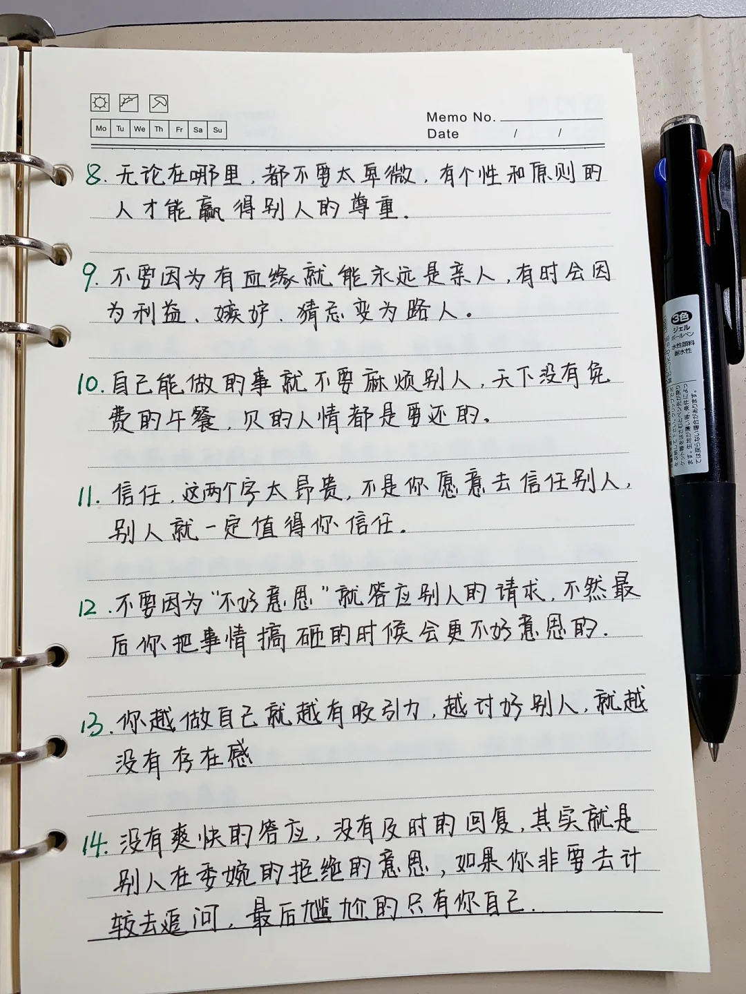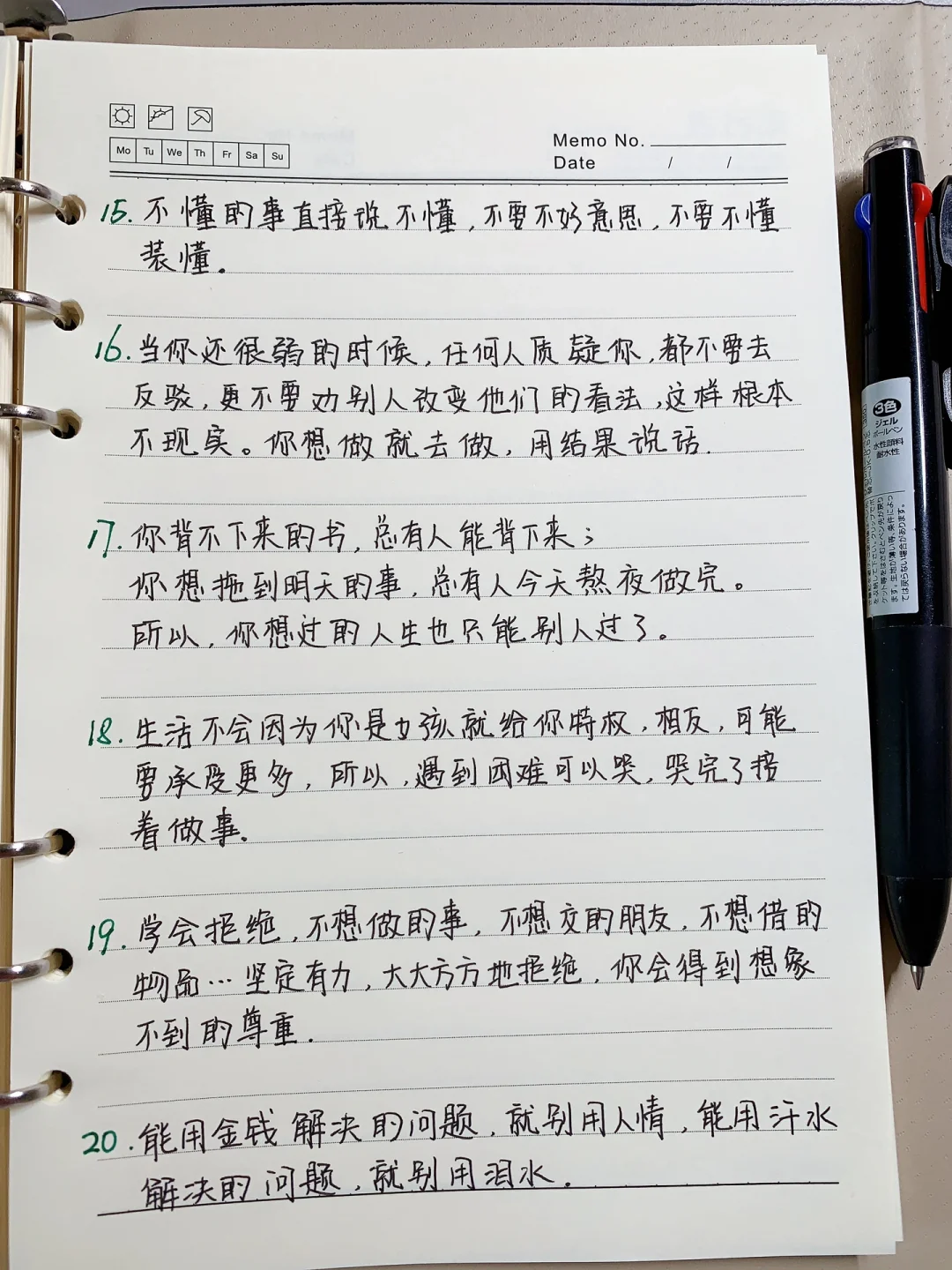 ☀️这个世界不仅有光明,还有黑暗; 不仅有好人还有坏人; 有善良就有残暴; 有正义就有邪恶。 除了告诉孩子: 没病没灾就是幸运, 吃饱穿暖就是幸福。 必备的“人间清醒”,也应该成为孩子成长路上的必修课。 [一R]——人生除了生死,其他都是擦伤。 [二R]——你的退让,带来的基本都是得寸进尺,别妄想能换来什么尊重和心疼。 [三R]——不要轻易对他人承诺,也不要相信别人的承诺。 [四R]——永远记住,尊重的前提是实力相当。 [五R]——很多时候,你得罪人不是因为你说错了,而是因为你说对了。 [六R]——人际交往的前提,是舒服,而不是折磨。 [七R]——提高自己的抗击打能力,被批评了就去提升自己,失败了就想办法成长。很多人一辈子不是毁于不行,而是毁于自弃。 [八R]——无论在哪里,都不要太卑微,有个性和原则的人才能赢得别人的尊重。 [九R]——不要因为有血缘就能永远是亲人,有时会因为利益、嫉妒、猜忌变成路人。 [一R][零R]——自己能做的事就不要麻烦别人,天下没有免费的午餐,欠的人情都是要还的。 [一R][一R]——信任,这两个字太昂贵,不是你愿意去信任别人,别人就一定值得你信任。 [一R][二R]——不要因为“不好意思”就答应别人的请求,不然最后你把事情搞砸的时候会更不好意思的。 [一R][三R]——你越做自己就越有吸引力,越讨好别人,就越没有存在感。 [一R][四R]——没有爽快的答应,没有及时的回复,其实就是别人在委婉的拒绝的意思,如果你非要去计较去追问,最后尴尬的自由你自己。 [一R][五R]——不懂的事直接说不懂,不要不好意思,这比不懂装懂更显的自信。 [一R][六R]——当你还很弱的时候,任何人质疑你,都不要去反驳,更不要劝别人改变他们的看法,这样根本不现实。你想做就去做,用结果说话。 [一R][七R]——你背不下来的书,总有人能背下来; 你想拖到明天的事,总有人今天熬夜做完。 所以,你想过的人生也只能别人过了。 [一R][八R]——生活不会因为你是女孩就给你特权,相反,可能要承受的更多,所以,遇到困难可以哭,哭完了接着做事。 [一R][九R]——学会拒绝,不想做的事,不想交的朋友,不想借的物品…坚定有力,大大方方的拒绝,你会得到想象不到的尊重。 [二R][零R]——能用金钱解决的问题,就别用人情,能用汗水解决的问题,就别用泪水。 育儿 孩子教育 学习日常 父母与孩子 人间清醒 必修课 家庭教育 自我成长