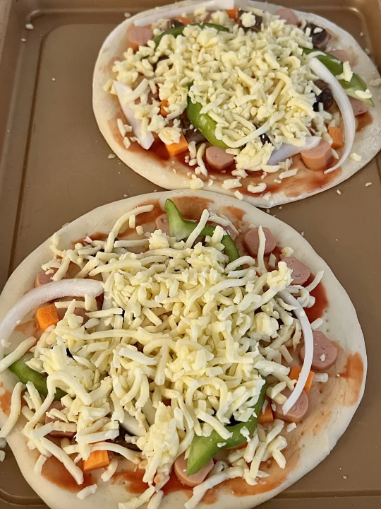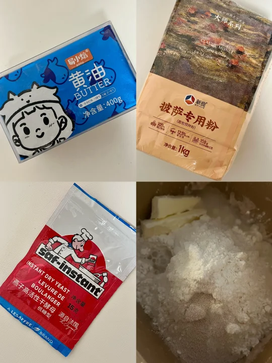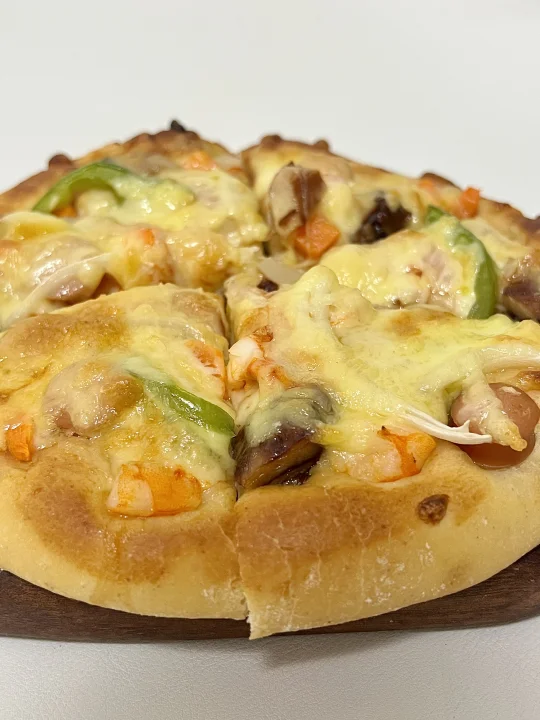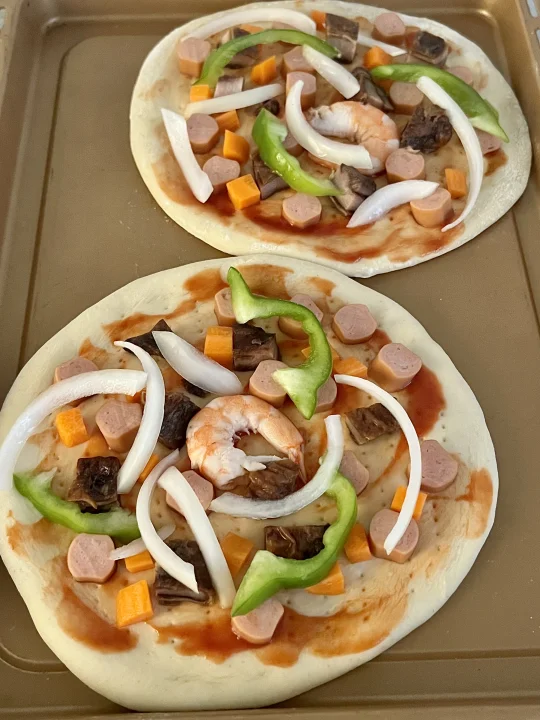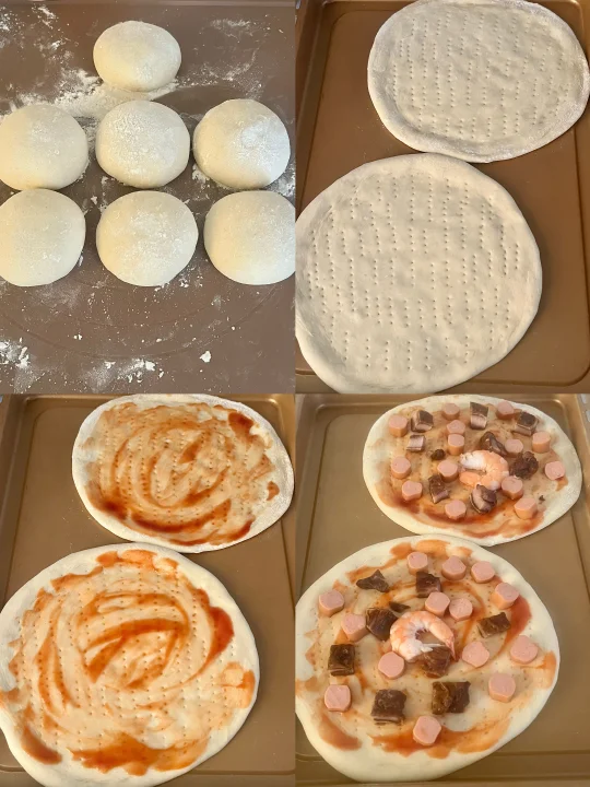 🍕饼皮部分 【材料准备】 新良大师披萨粉500克|耐低糖燕子酵母5克|白糖30克|盐4克|水350克|易小焙黄油40克 【制作步骤】 1️⃣饼皮面团材料混合揉均匀 2️⃣面团发酵至两倍大 3️⃣发酵好的面团排气,分成7个小面团,揉圆后盖上湿布松弛15分钟。 4️⃣把松弛好的小面团整理成圆形薄片,用叉子在饼皮表面扎满小孔,防止烤制时饼皮鼓起,静置二次发酵至1.5倍大 - 🍕馅料部分 鸡排切片,香肠切片,虾仁需要提前煮熟切小块备用,青椒、洋葱和胡萝卜切丁 - 🍕组装 1️⃣饼皮表面均匀涂抹一层披萨酱或者番茄酱 2️⃣依次铺上喜欢的馅料,最后撒上厚厚的马苏里拉芝士 3️⃣组装好的披萨吃不完可以放入密封容器或保鲜袋,冷藏可保存1 - 2天,冷冻能存放1 - 2个月。 - 🍕烤制 预热至200℃的烤箱,烤制20分钟,至芝士融化且表面金黄焦香。