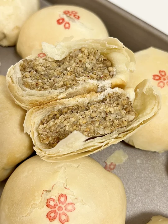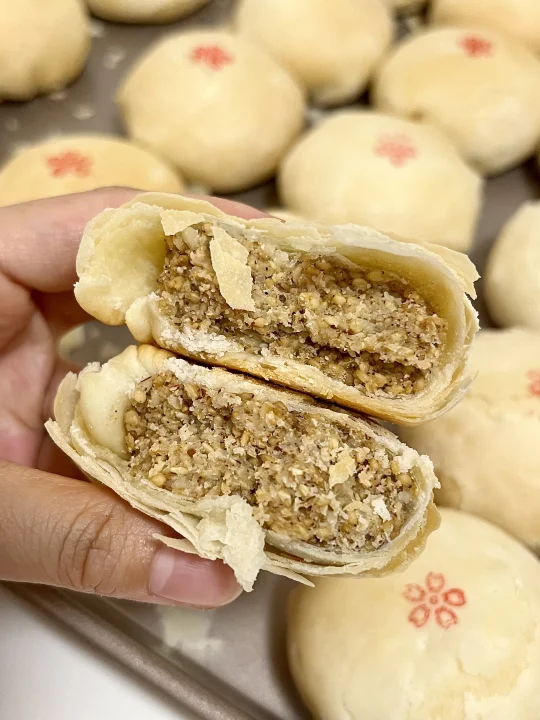 •椒盐馅:核桃仁150克|熟白芝麻130克|花生120克|新良大师中式糕点粉240克|细砂糖80克|椒盐粉6克|花生油120克