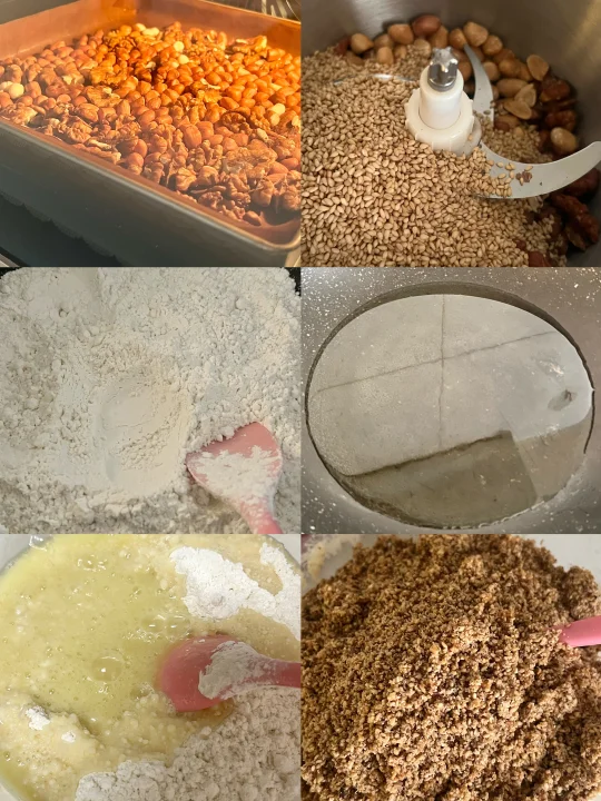 -花生油上锅烧至起泡,倒入炒熟的面粉中,再加入椒盐粉和坚果碎,混合成团,分成24个,每个约32克,捏实后放入冰箱冷冻定型