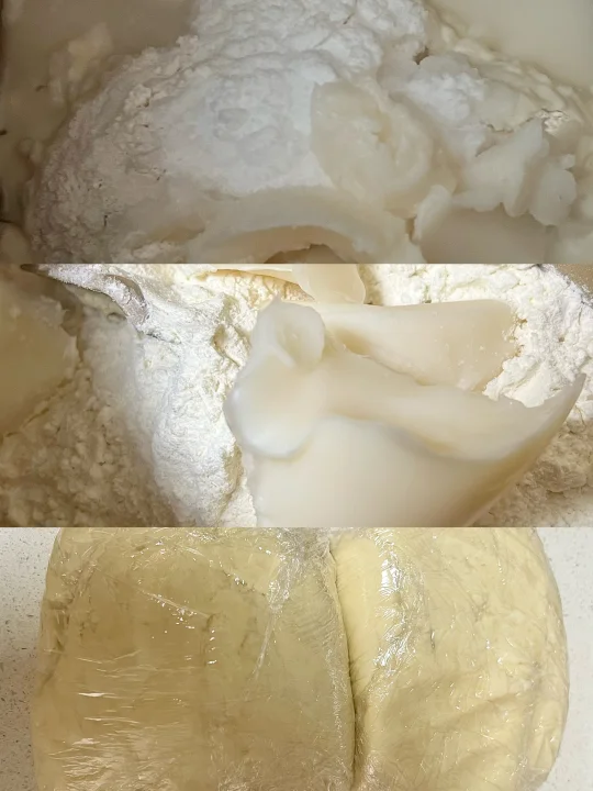 2️⃣制作油皮:将油皮材料揉成光滑的面团,包上保鲜膜冷藏备用