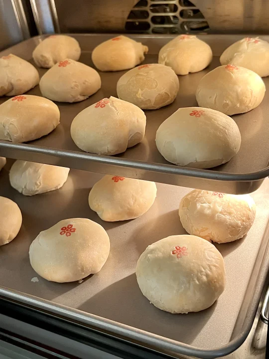 8️⃣装饰:红色色素和水调成印泥,在月饼表面盖上印章