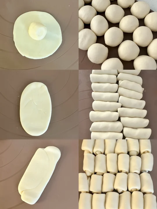 6️⃣擀卷:将松弛好的面团擀成牛舌形,自上而下卷起,盖上保鲜膜,再次松弛15分钟。然后取一个面团,收口朝上,稍稍按扁,擀长,卷起成筒状,全部卷好后再松弛15分钟