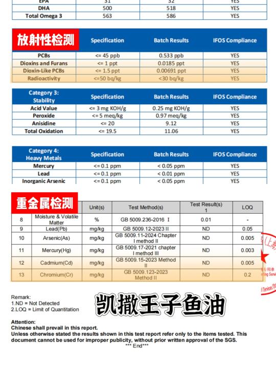 ✍🏻其中秘鲁渔场因为上升补偿流(秘鲁寒流),让秘鲁渔场的生态系统有较强的自我修复能力,而且远离北半球渔场,距离排污海域也很远,很多知名品牌鱼油原料也是源于秘鲁渔场。除了要看鱼油的官方产地之外,实际选择中首先还要关注的就是放射性指标和重金属指标,以凯撒王子鱼油的检测结果为例为例