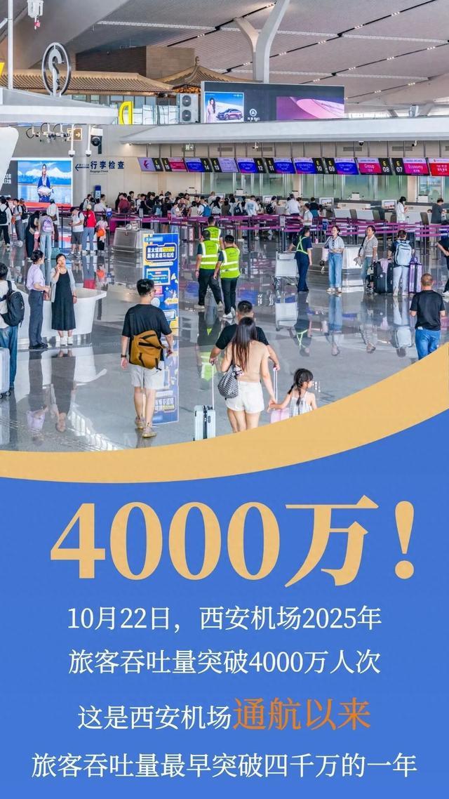 民航资源网2025年10月28日消息:10月22日,西安咸阳国际机场2025年旅客吞吐量突破4000万人次,达到4005万人次,较2024年提前10天。这是西安咸阳国际机场通航以来,旅客吞吐量最早突破4000万的一年。
