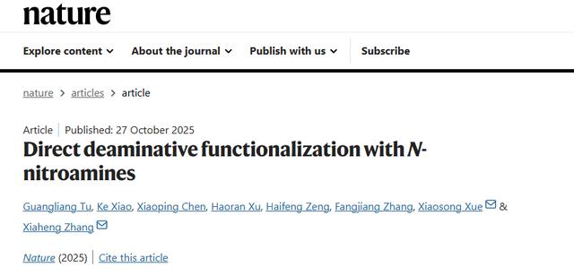 10月28日凌晨,中国科学院大学杭州高等研究院(以下简称“国科大杭高院”)张夏衡团队在《自然》主刊上发表题为“DirectdeaminativefunctionalizationwithN-nitroamines(N-硝基胺介导直接脱氨官能团化)”的研究成果。该研究创新提出“直接脱氨”策略,实现了对芳香胺类化合物的高效、安全转化,而芳香胺作为多数药物构建的基础“结构单元”,为抗癌药等药物合成开辟了更经济、更环保的技术路径。