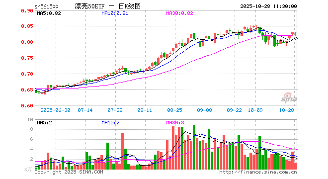 10月28日,截止午间收盘,漂亮50ETF(561500)涨0.24%,报0.831元,成交额100.24万元。漂亮50ETF(561500)重仓股方面,东方财富截止午盘涨1.15%,恒瑞医药跌4.67%,迈瑞医疗涨1.21%,豪威集团涨3.09%,万华化学跌0.62%,阳光电源涨1.28%,福耀玻璃跌1.92%,长安汽车跌0.63%,金山办公涨8.25%,同花顺涨3.33%。