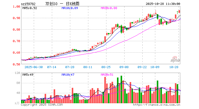 10月28日,截止午间收盘,双创50ETF(159782)涨1.37%,报0.963元,成交额2978.36万元。双创50ETF(159782)重仓股方面,宁德时代截止午盘涨1.51%,新易盛涨3.98%,中际旭创涨3.81%,中芯国际涨0.39%,寒武纪跌0.29%,阳光电源涨1.28%,海光信息涨0.38%,澜起科技跌0.36%,胜宏科技跌0.70%,汇川技术涨0.23%。