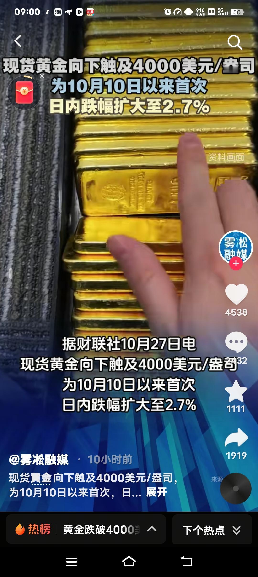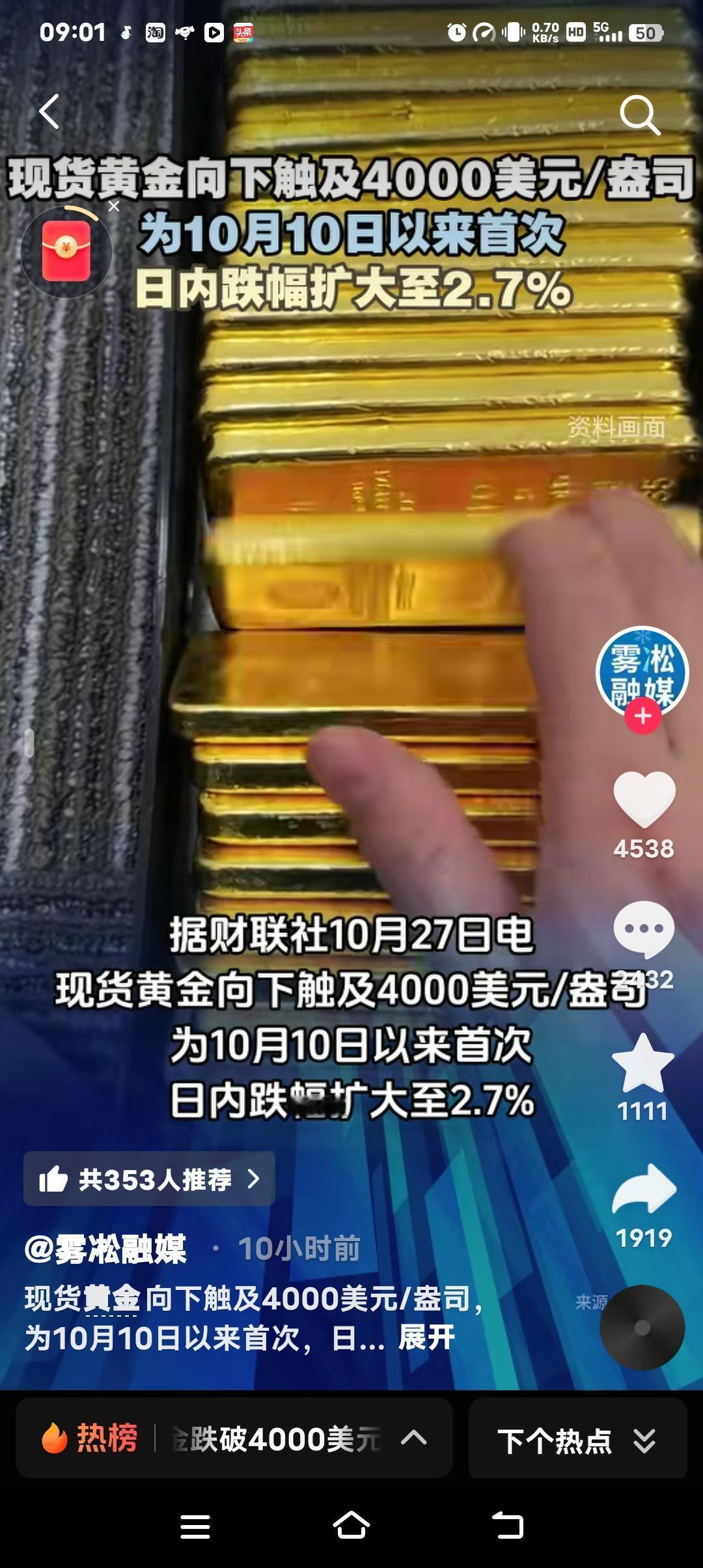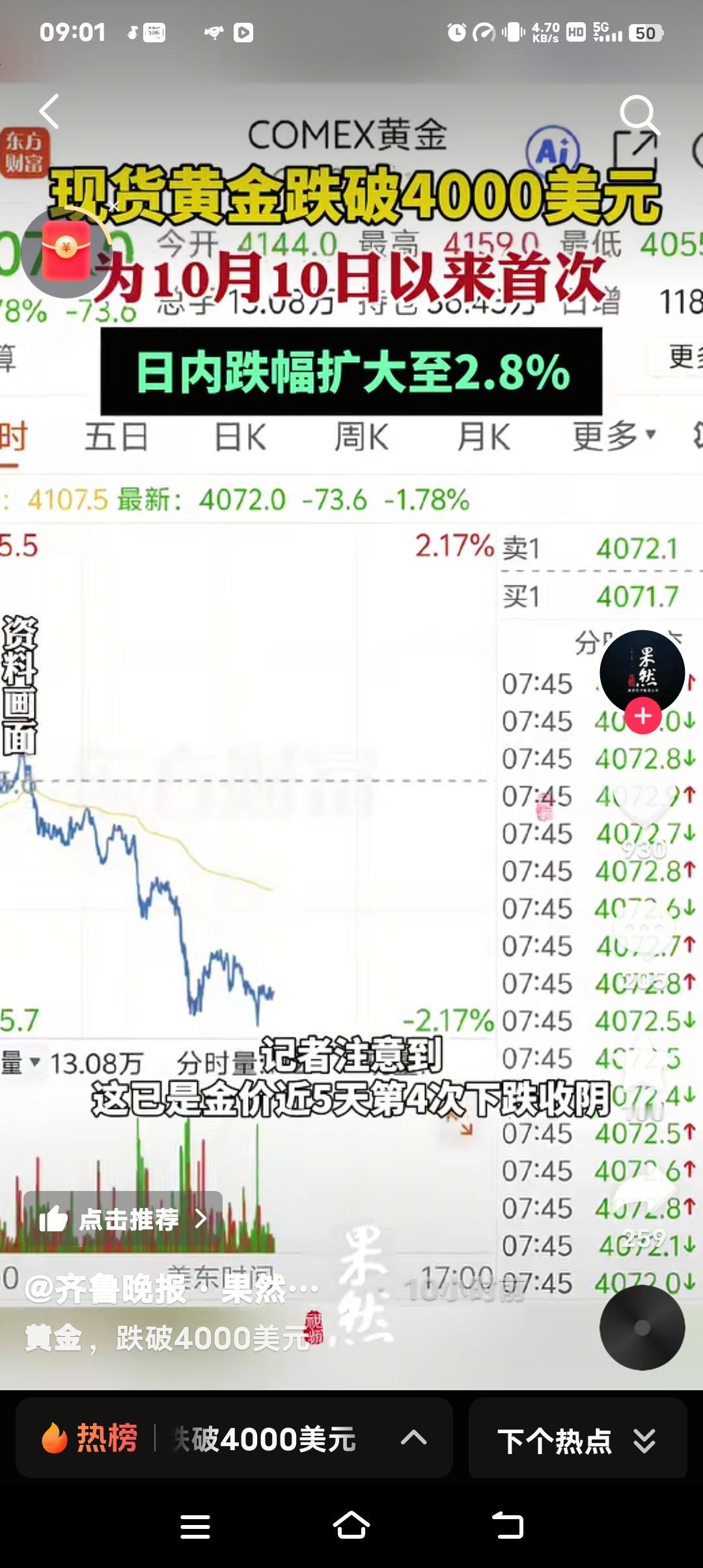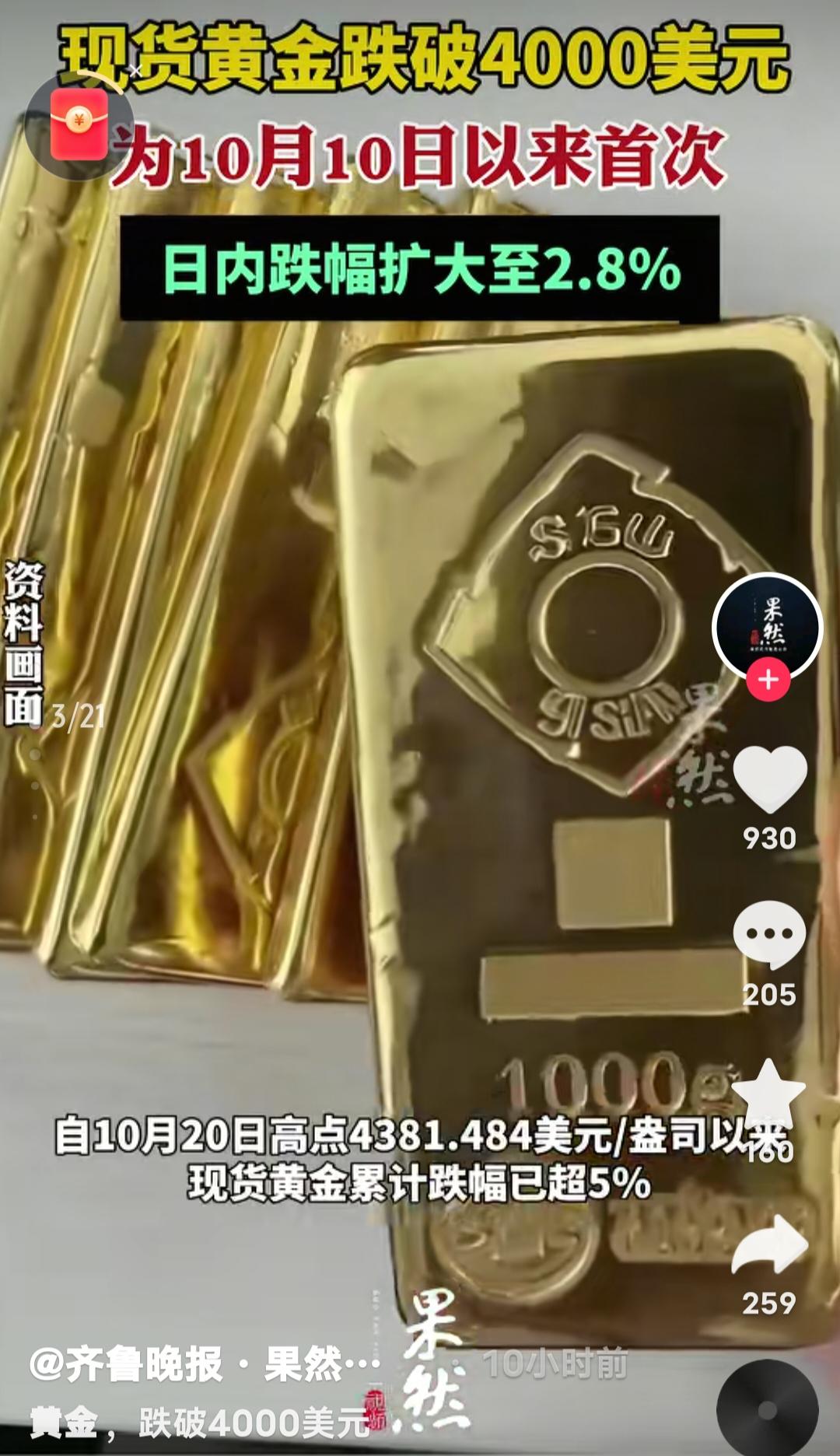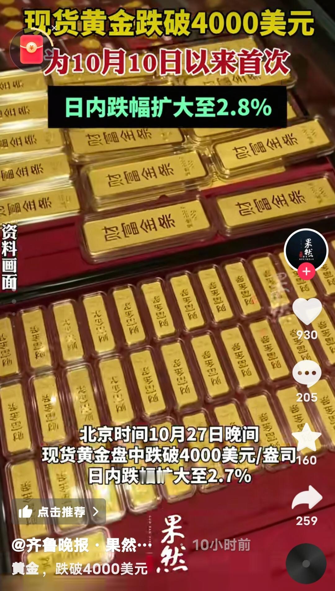 黄金暴跌背后:一场全球资本的“大逃杀”,普通人该如何守住钱袋子? 当金价突然跌破4000美元/盎司,日内跌幅扩大至2.7%,市场一片哗然。这不仅是10月10日以来的首次暴跌,更释放了一个危险信号——全球资本正在上演一场无声的“大逃杀”。 1. 黄金暴跌,真的是“避险资产”神话破灭? “黄金永远保值”的信仰,正在被现实狠狠打脸。 过去几年,无数人把黄金当作对抗通胀的“避风港”,甚至有人倾家荡产囤金条。但今天的暴跌,让这些人的美梦瞬间破碎。 为什么黄金突然不香了? 美联储的“鹰派”加息:市场预期11月美联储可能继续加息,美元走强,黄金作为无息资产,吸引力大幅下降。 全球资本回流美国:美债收益率飙升,资金从黄金、股市、房地产等市场疯狂撤离,寻找更安全的去处。 地缘政治降温:巴以冲突未进一步升级,市场避险情绪减弱,黄金的“战争溢价”被挤出。 2. 暴跌背后,是普通人的财富保卫战 你以为这只是金融市场的数字游戏?不,它直接影响你的钱包! 囤金大妈哭了:那些在4200美元高位接盘的人,现在每盎司亏200美元,一公斤黄金直接亏6万! 黄金首饰商慌了:金价暴跌,消费者观望,库存积压,利润被吞噬。 理财投资者懵了:黄金ETF、纸黄金持有者,账户一夜缩水,进退两难。 3. 普通人该怎么办?别被恐慌收割! 市场越是恐慌,越要保持清醒。 短期别抄底:金价可能继续下探,3800-3900美元才是关键支撑位。 长期仍可配置:黄金作为抗通胀资产,未来仍有价值,但别All in! 分散投资才是王道:别把所有钱押在黄金上,股票、债券、现金都要合理配置。 4. 更大的危机可能还在后面 这次黄金暴跌,只是全球资本大挪移的一个缩影。 美元霸权仍在:只要美联储继续加息,全球资产价格都可能被“收割”。 经济衰退风险:如果美国经济硬着陆,黄金可能再次成为避险选择,但现在还不是时候。 普通人最该警惕什么?——别被情绪左右,别盲目跟风,守住现金流才是关键! 这次黄金暴跌,你怎么看? 是抄底机会,还是陷阱? 你还会继续买黄金吗? 普通人到底该怎么应对这场资本风暴? 评论区见! 你的观点,可能拯救无数人的财富!金价下跌 资本逃离