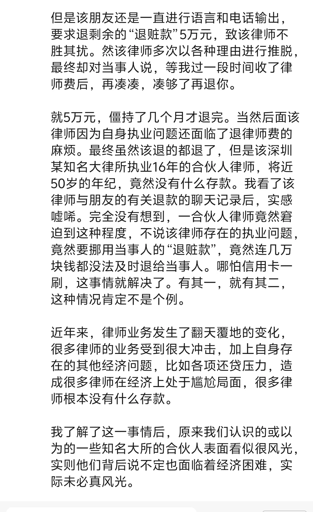 就5万元,僵持了几个月才退完。当然后面该律师因为自身执业问题还面临了退律师费的麻烦。最终虽然该退的都退了,但是该深圳某知名大律所执业16年的合伙人律师,将近50岁的年纪,竟然没有什么存款。我看了该律师与朋友的有关退款的聊天记录后,实感嘘唏。完全没有想到,一合伙人律师竟然窘迫到这种程度,不说该律师存在的执业问题,竟然要挪用当事人的“退赃款”,竟然连几万块钱都没法及时退给当事人。哪怕信用卡一刷,这事情就解决了。有其一,就有其二,这种情况肯定不是个例。