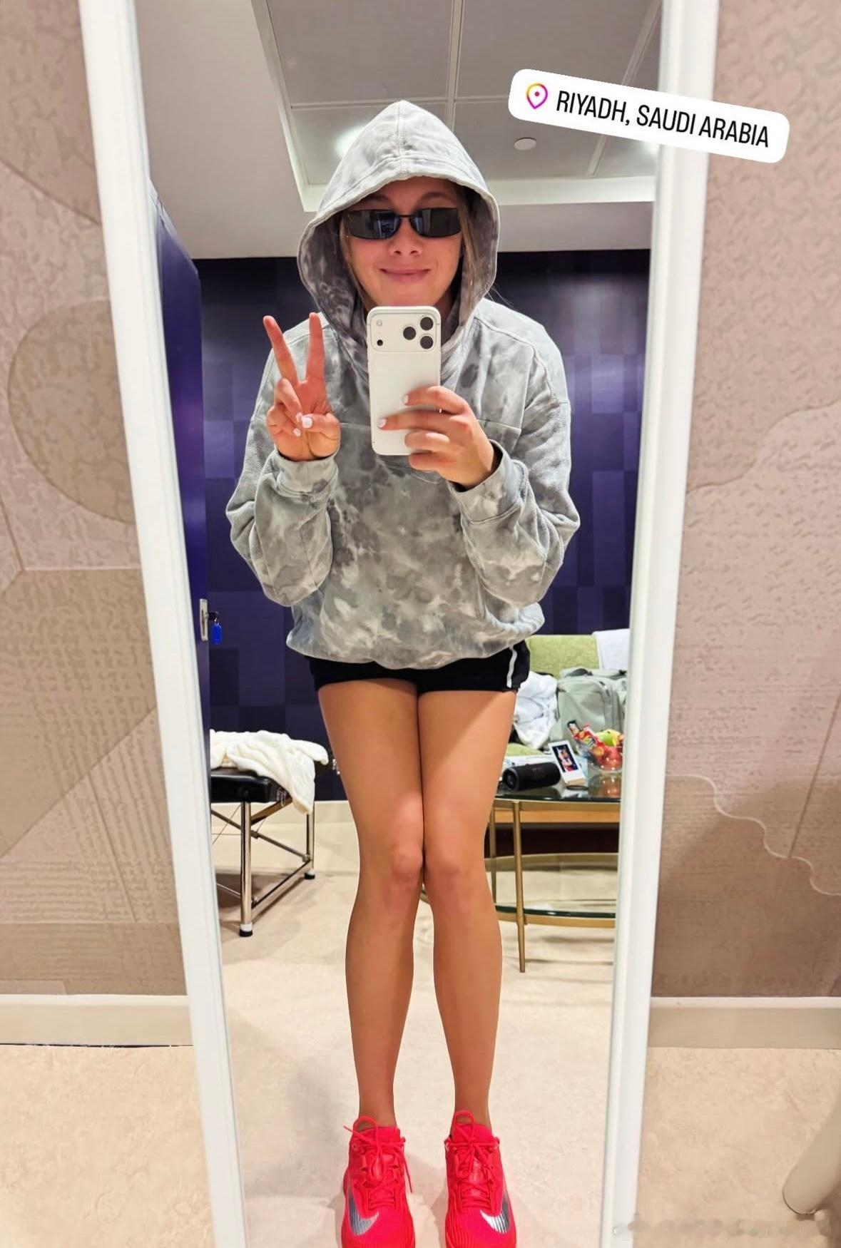 阿尼西莫娃[哇]分享在利雅得WTA年终总决赛生活!戴上墨镜在室内镜子前拍一张Am