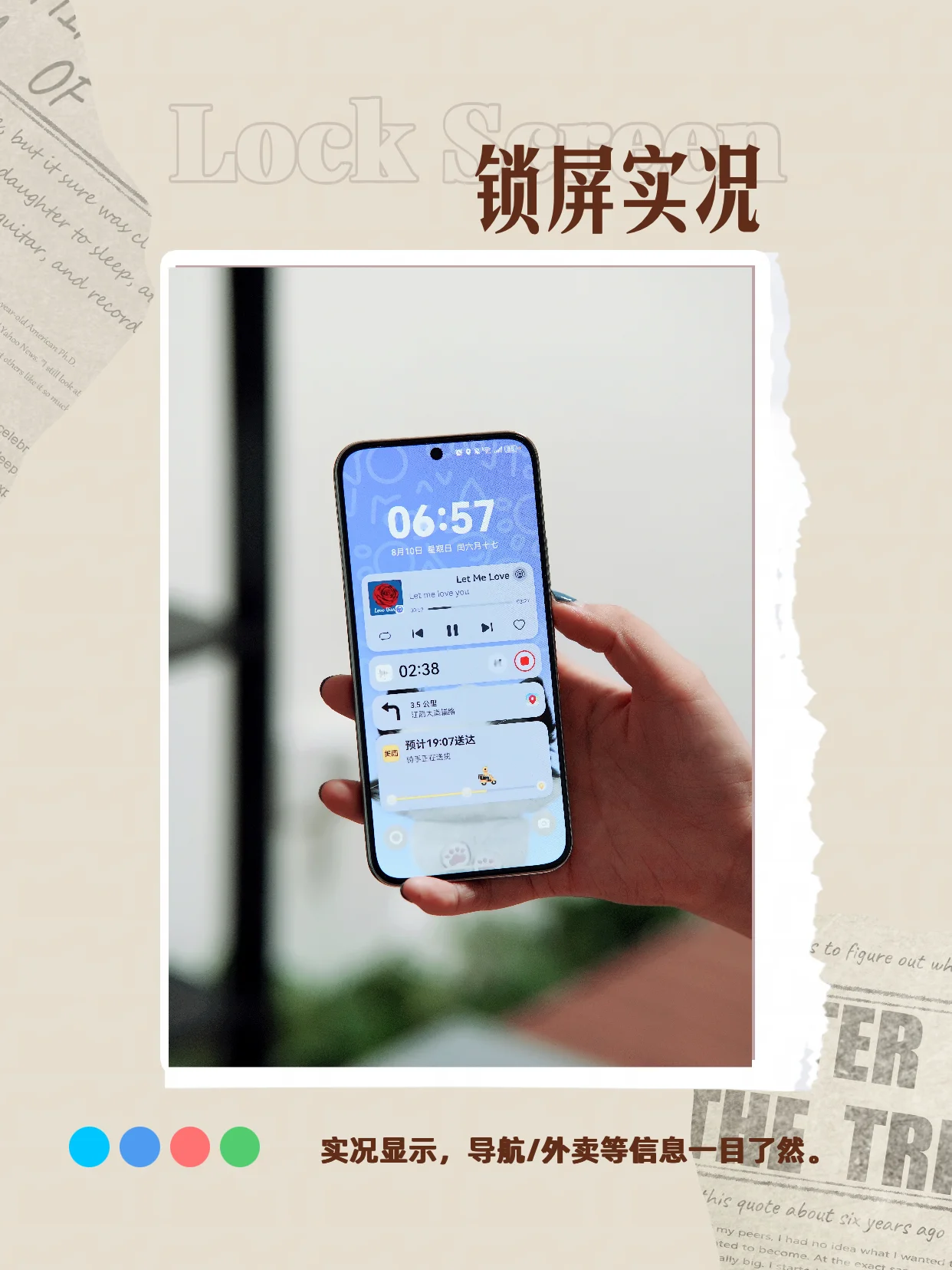 锁屏看透一切: 外卖距离/音乐歌词显示/导航路线→不用切APP直接瞟一眼锁屏,美团/滴滴/高德等60+App全接入,开车/做饭再不怕错过信息!