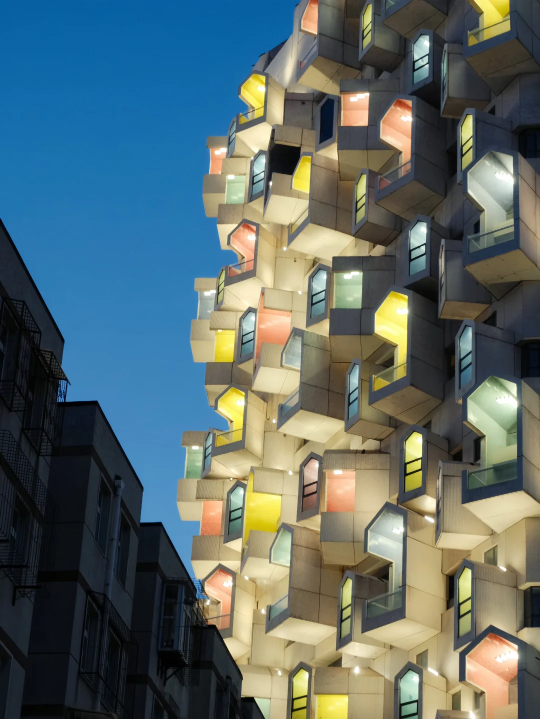 旁边的老旧小区像现实中的赛博朋克空间站,傍晚6点亮灯蓝调贼美