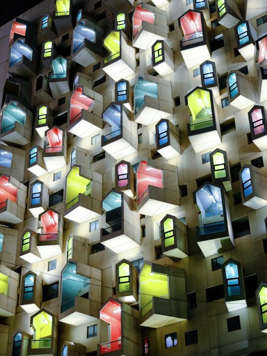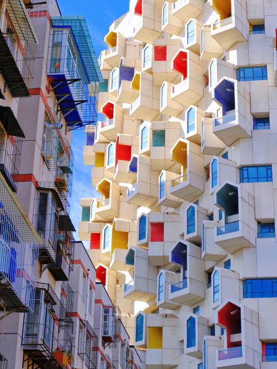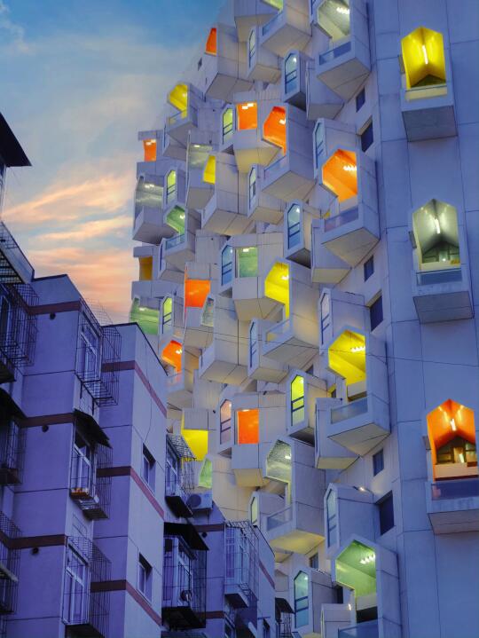 旁边的老旧小区像现实中的赛博朋克空间站,傍晚6点亮灯蓝调贼美