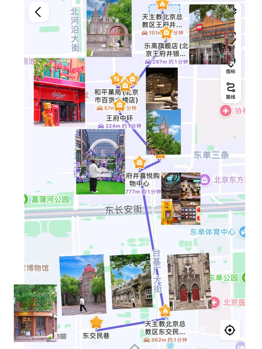 草厂胡同👉东交民巷👉王府井喜悦中心👉王府井书店👉王府中环👉Hamleys玩具店👉北京市百货大楼👉乐高乐园 👉王府井教堂