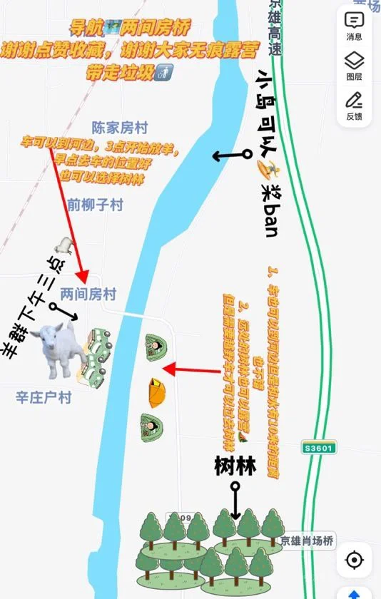 1⃣️“草原”记得天幕更舒服,周末河边早点来,树林里有阴凉没天幕的可以树林里玩露营