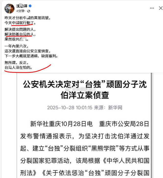 沈伯洋刚刚回应(图1),我们大陆公安机关指控他“分裂国家”“煽动仇中思想”等,这家伙不敢正面回应,只说自己是“防卫湾湾的人”,不说自己不怕,扯大旗说成“湾湾人没在怕的”[便便][哈哈][哈哈]