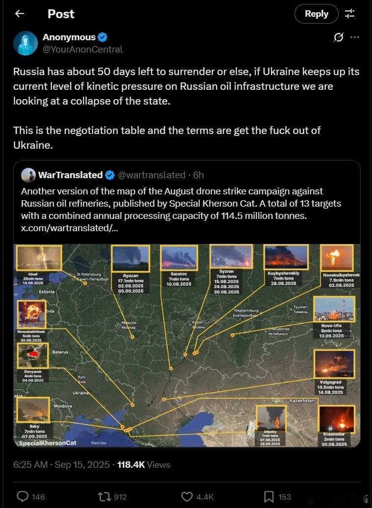 似乎每个人都忽略了俄罗斯每周数百次的无人机袭击(不是发射,是袭击),这些无人机袭击了具有军事意义的目标,并对整体消耗战做出了巨大贡献。但西方朋友告诉所有人别担心……再过 50 天,俄罗斯就会崩溃。