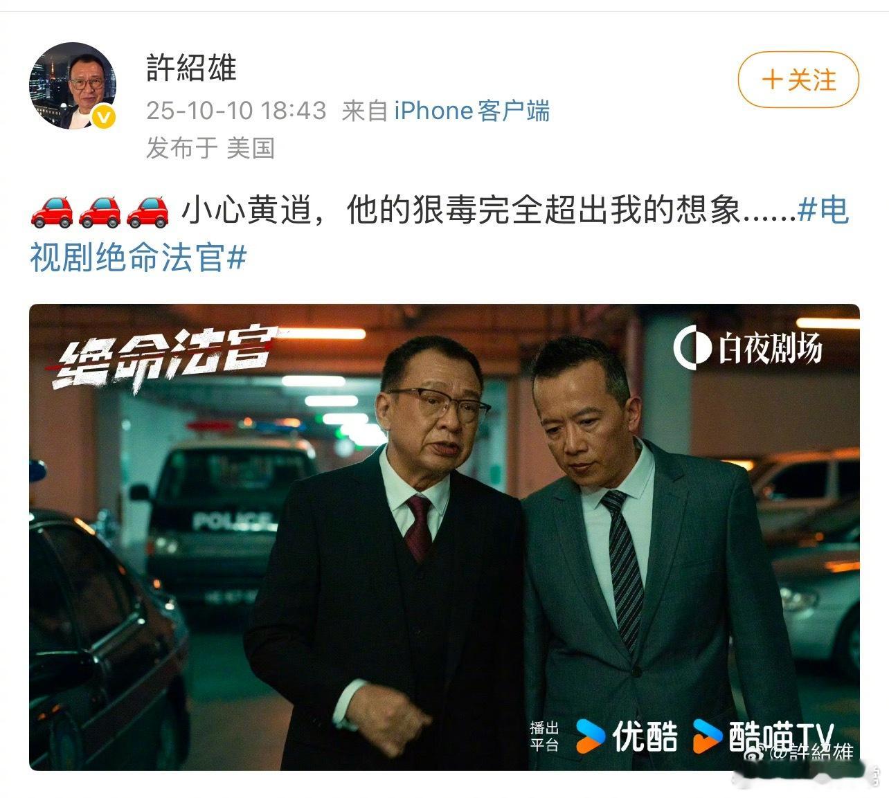 许绍雄最后一次公开露面是中秋节和朋友们聚餐,九月还被拍到跟女婿一起买菜,最后一条微博是本月10日宣传新剧