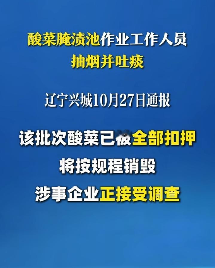 辽宁兴城酸菜腌渍池吐痰事件通报来了:“涉事批次酸菜已被全部扣押,将按规程销毁,涉