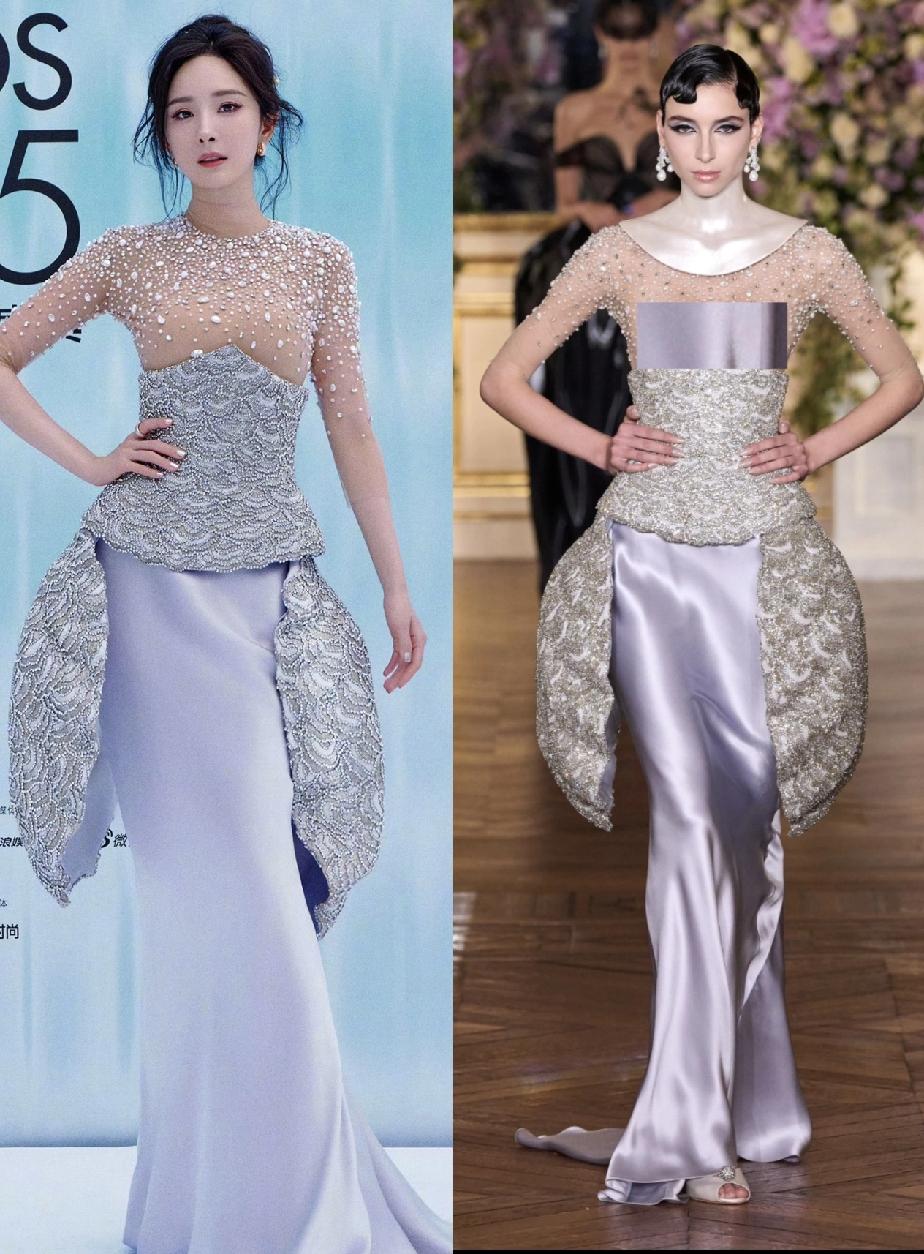杨幂是真的很敢穿,但这礼服也是真的不好看。图一她是加了一层内衬图二模特版本