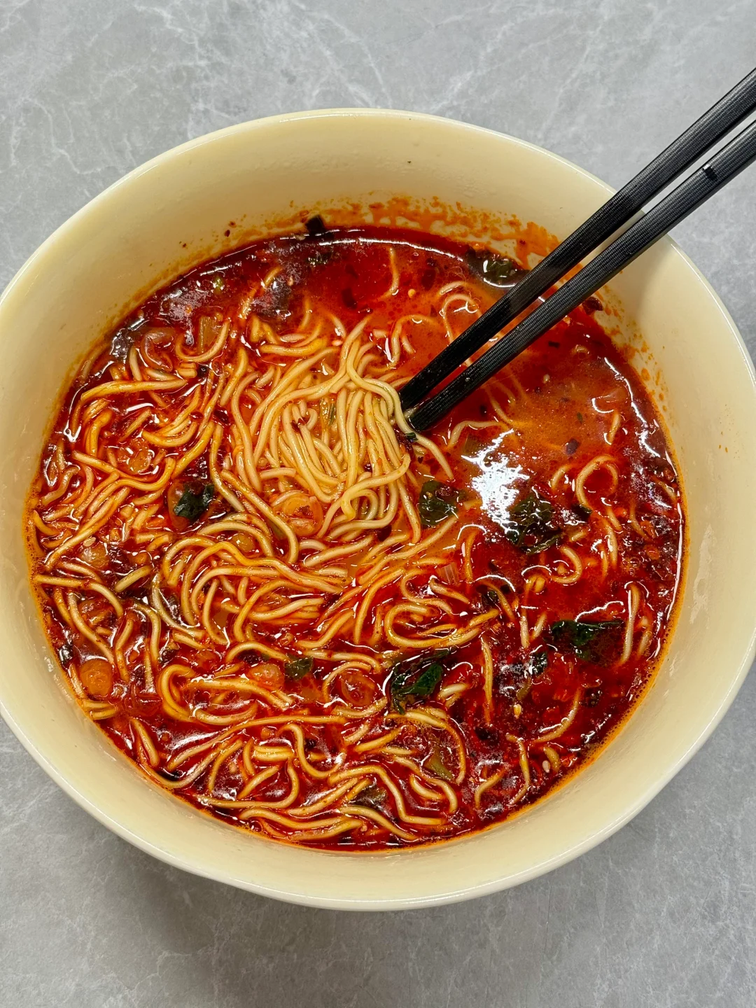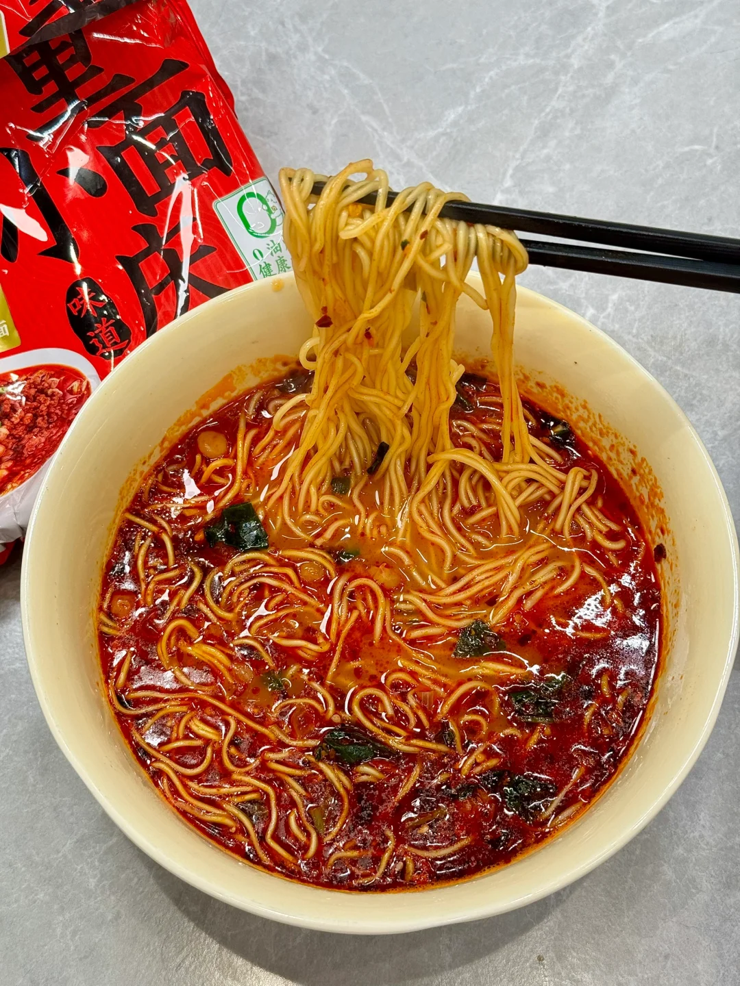 面有点像那种有点嚼劲的鸡蛋面~ 汤头真的有重庆小面那股冲辣味 爱吃辣的可以试试速食面