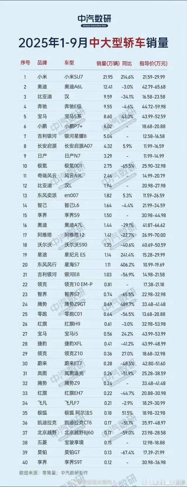整天有人要干翻BBA,结果一看销量就露馅了,目前中大型轿车唯一能抗衡BBA的也就是小米了!截止9月份,2025年中大型轿车小米SU7遥遥领先,而且还是断崖式领先,销量21.95万辆,就问你猛不猛?