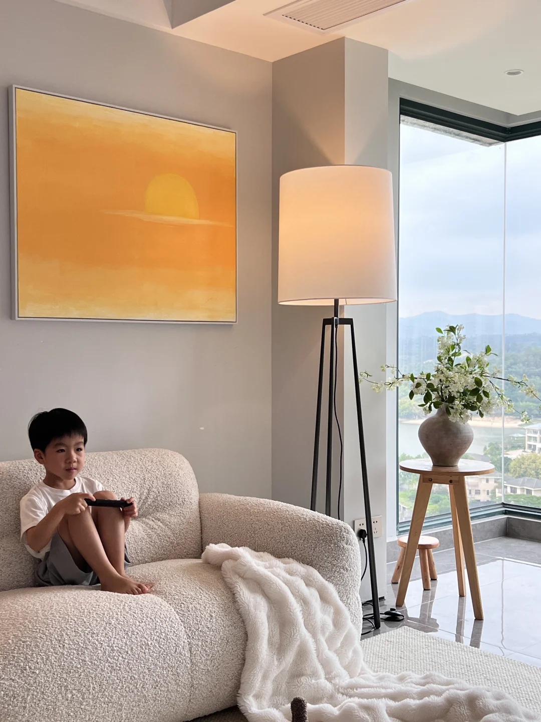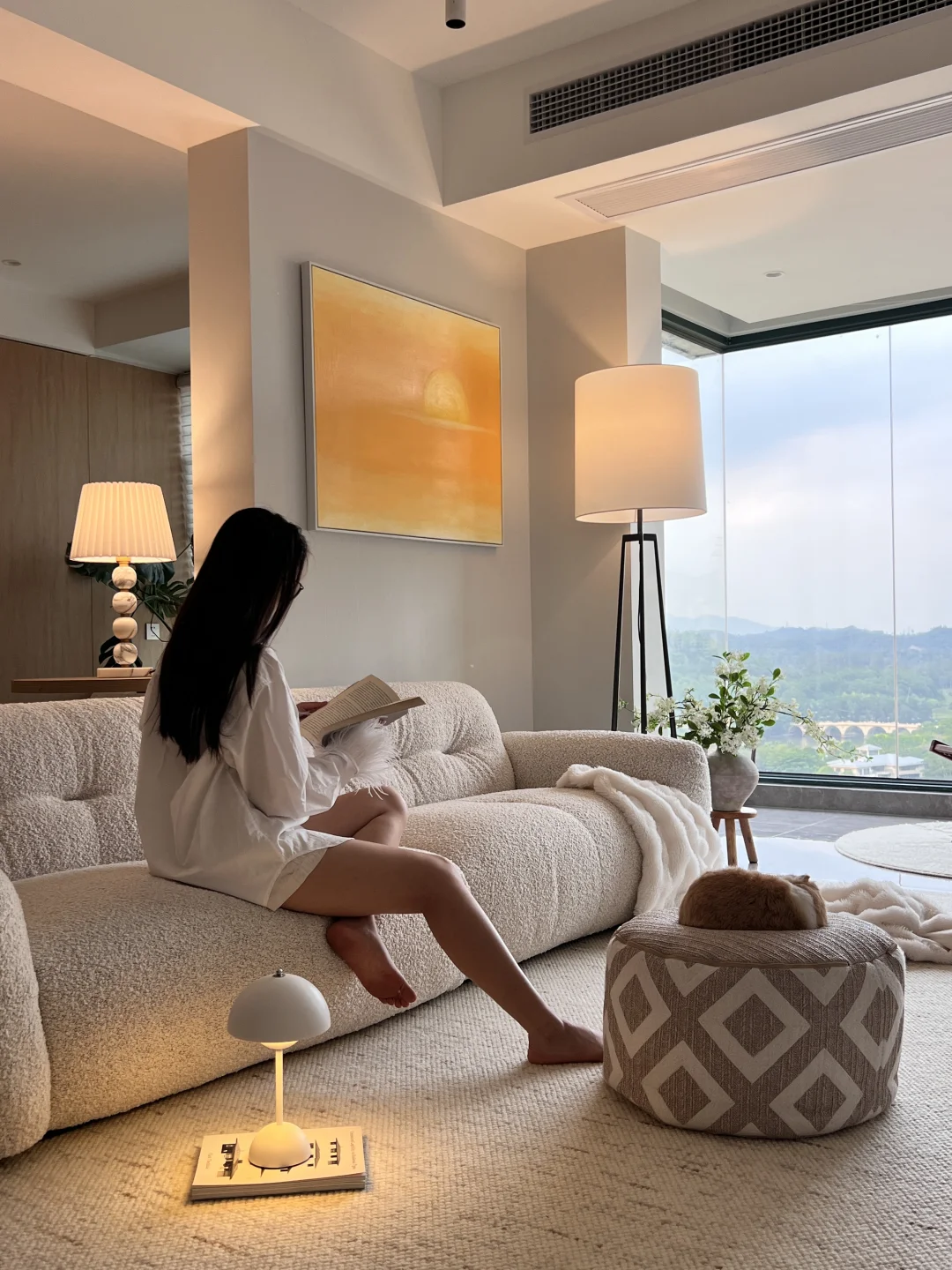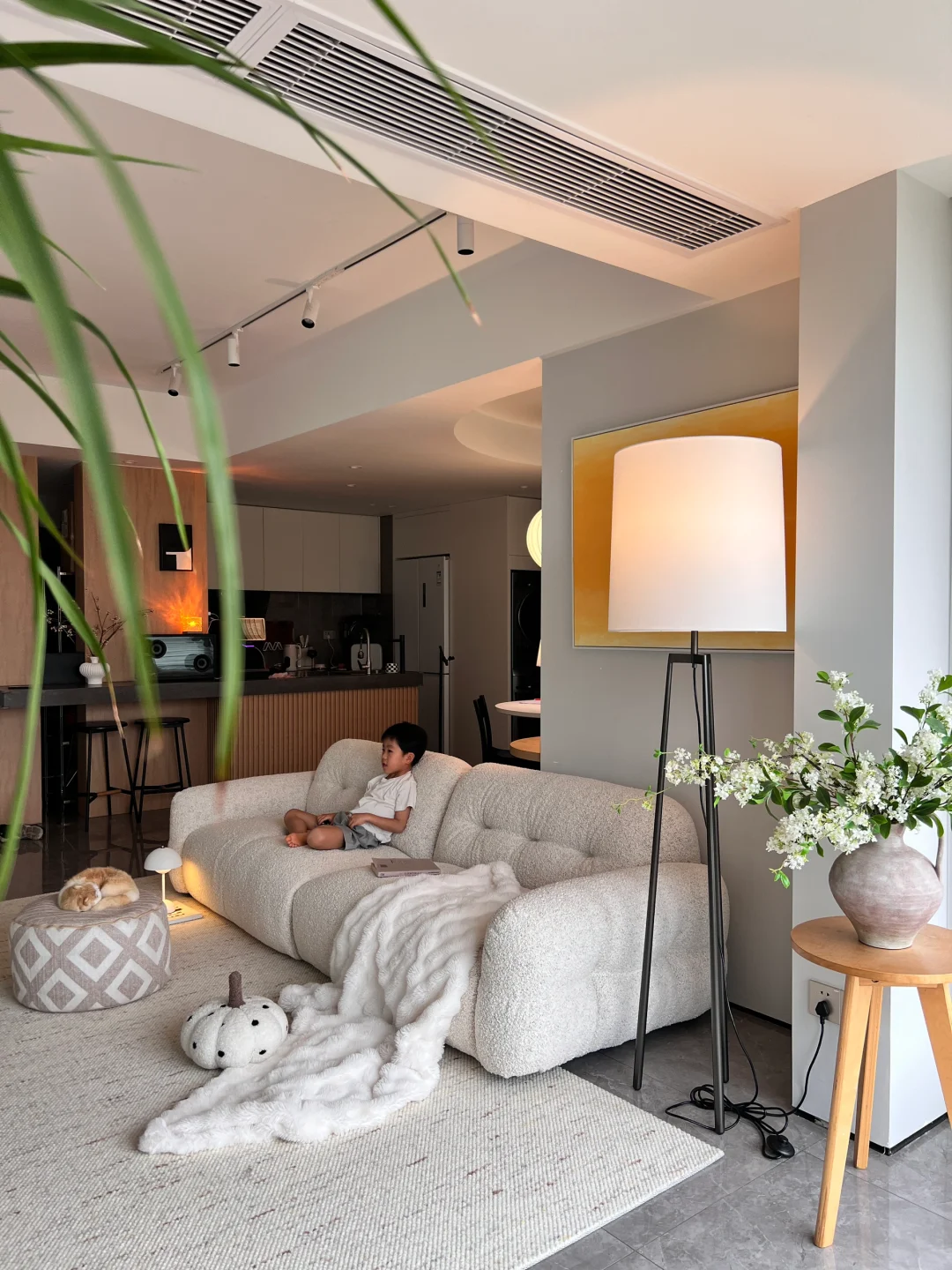 当初是为了窗外的景色买的房子,户型是非常不满意的,开发商为了三房都面湖,所以房间设计不太合理,客厅走到主卧要拐几个弯,经过设计之后成了我的梦中情房! 🏠关于我家: 建面126平,套内99平,两房一厅两卫生间一衣帽间一储物间! ➡️拆掉推拉门,打通阳台,客厅阳台一体yyds! ➡️不做复杂背景墙,极简电视背景简约又省钱! ➡️开放式厨房,让整个空间都很通透明亮! ➡️软装搭配色调以白色木色为主,白色沙发搭配舒适的地毯也增加家的温馨和氛围感!
