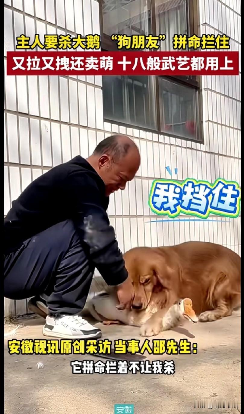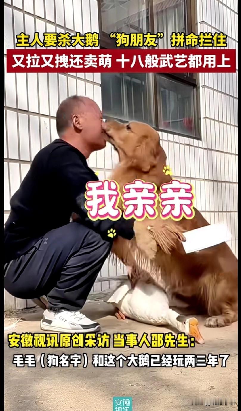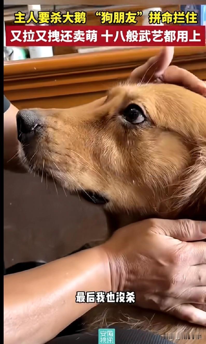 这狗朋友能处!主人要杀大鹅吃肉,没想到小狗看到后拼命的阻拦,不断地拉着主人拿刀的手,主人挣脱开了,小狗又继续阻拦,并且去和主人亲亲,以让主人手下留情,后来甚至把大鹅保护在身底下,让主人无法下手。最后主人放弃了,小狗看着主人流泪了。 原来这位小狗和大鹅已经在一起玩了两三年了。 小狗与这位大鹅的友谊还是挺深厚的,这小狗真的是太重情重义了!