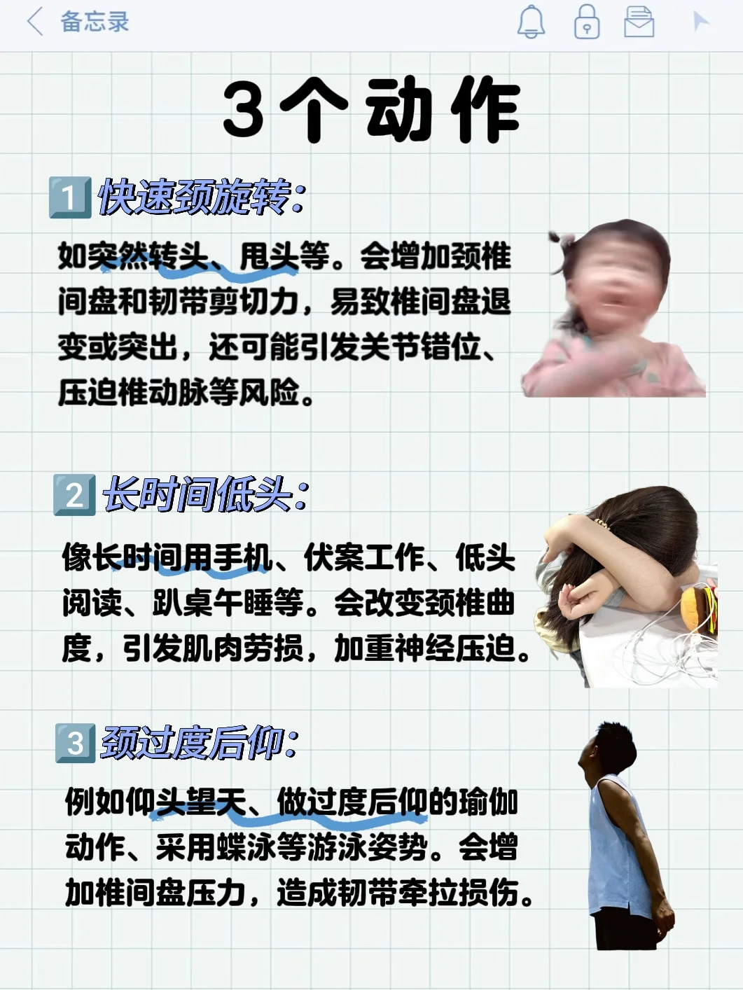 突然转头、甩头这类动作,会增加颈椎间盘和韧带的剪切力,头晕啥的都可能找上门!
