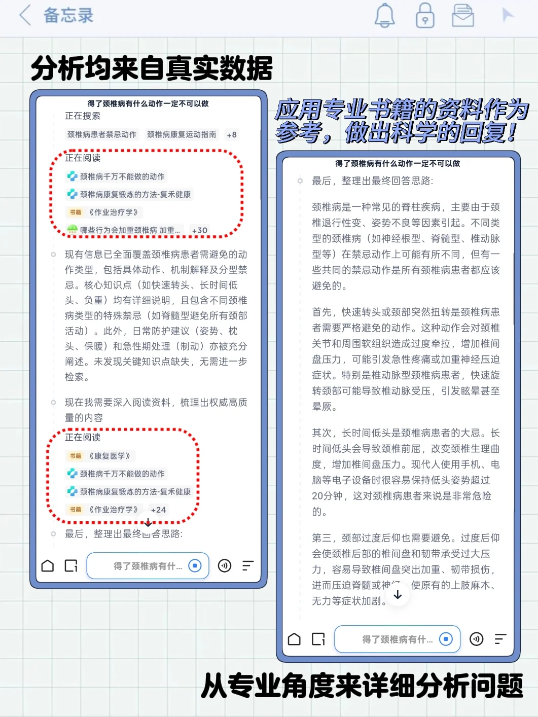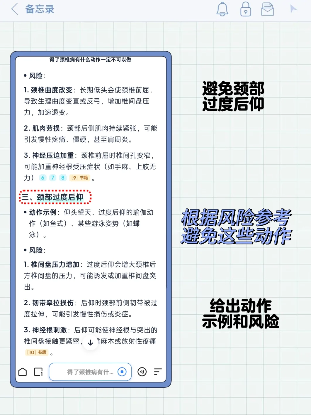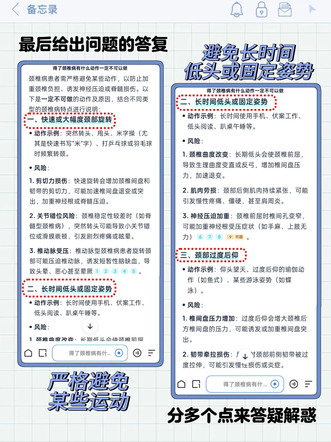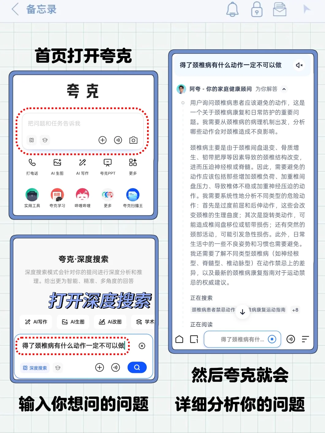 颈椎问题真的要重视,日常除了避免这些伤颈椎的动作,坐姿、睡姿都得注意。要是对颈椎养护还有更多疑问,比如适合的康复运动、日常护颈方法,都可以去问夸克。夸克深度搜索会从专业角度,结合真实数据和专业书籍资料,详细分析解答,超靠谱~ 希望大家都能拥有健康的颈椎,抬头挺胸,活力满满!💪