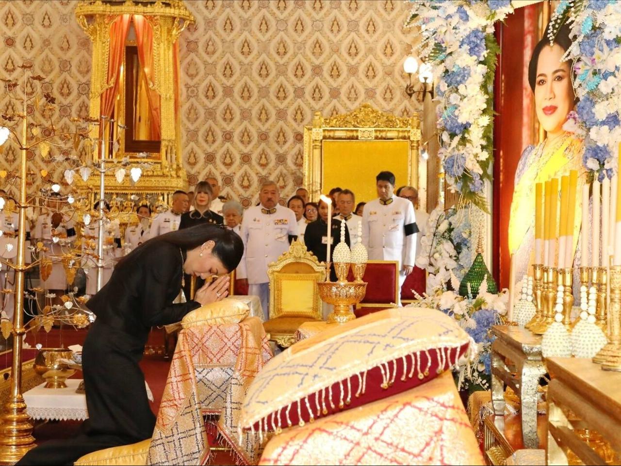 思蕊梵公主出席国葬,送别诗丽吉太后 泰国思蕊梵公主殿下,现身曼谷大皇宫都喜玛哈普拉萨王座大厅,为诗丽吉太后葬礼虔诚祈祷。她身着一袭黑丧服,尽显优雅气质,长发随风轻扬,仙气飘飘,举手投足间端庄大气、恰到好处。