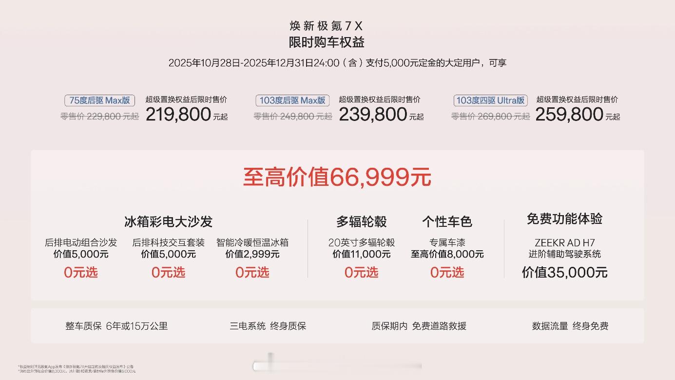 12月31日付5,000元大定,全系赠送冰箱彩电大沙发,免费升级20英寸265mm宽胎以及专属车漆,和终身免费的H7辅助驾驶;11月30日前下定锁单的,如因极氪原因,无法在2025年开票交付,导致无法全额享受购置税优惠,对于政策退坡产生的差额,也可以享受至高13,500元的购车尾款抵扣,算是一个兜底,反正权益给得是真厚道!