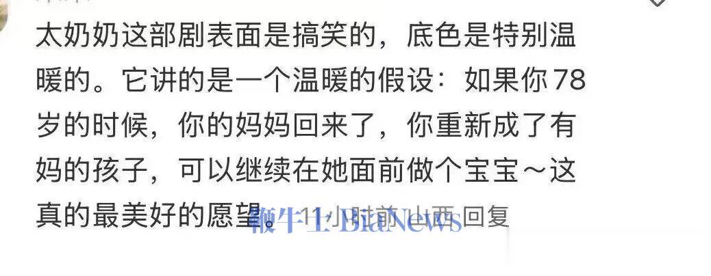 很多观众们看完剧后留言表示,“这部剧表面是搞笑的,底色是特别温暖的。它讲的是一个温暖的假设:如果你78岁时,你的妈妈回来了,你重新成了有妈的孩子,可以继续在她面前做个宝宝……”