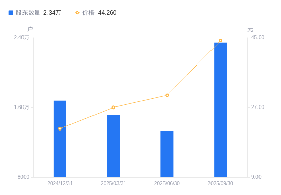 日期A股户数(户)流通A股户均持股数(股)户均持股市值(万元)2025-09-30234205131.4822.712025-06-30133439006.9127.172025-03-31151127952.5721.492024-12-31167787161.6415.422024-09-30145398264.5314.032024-06-30166677209.3410.502024-03-31173506925.1311.992023-12-31149068060.5816.752023-09-30162467395.7315.132023-06-301120810720.1122.24