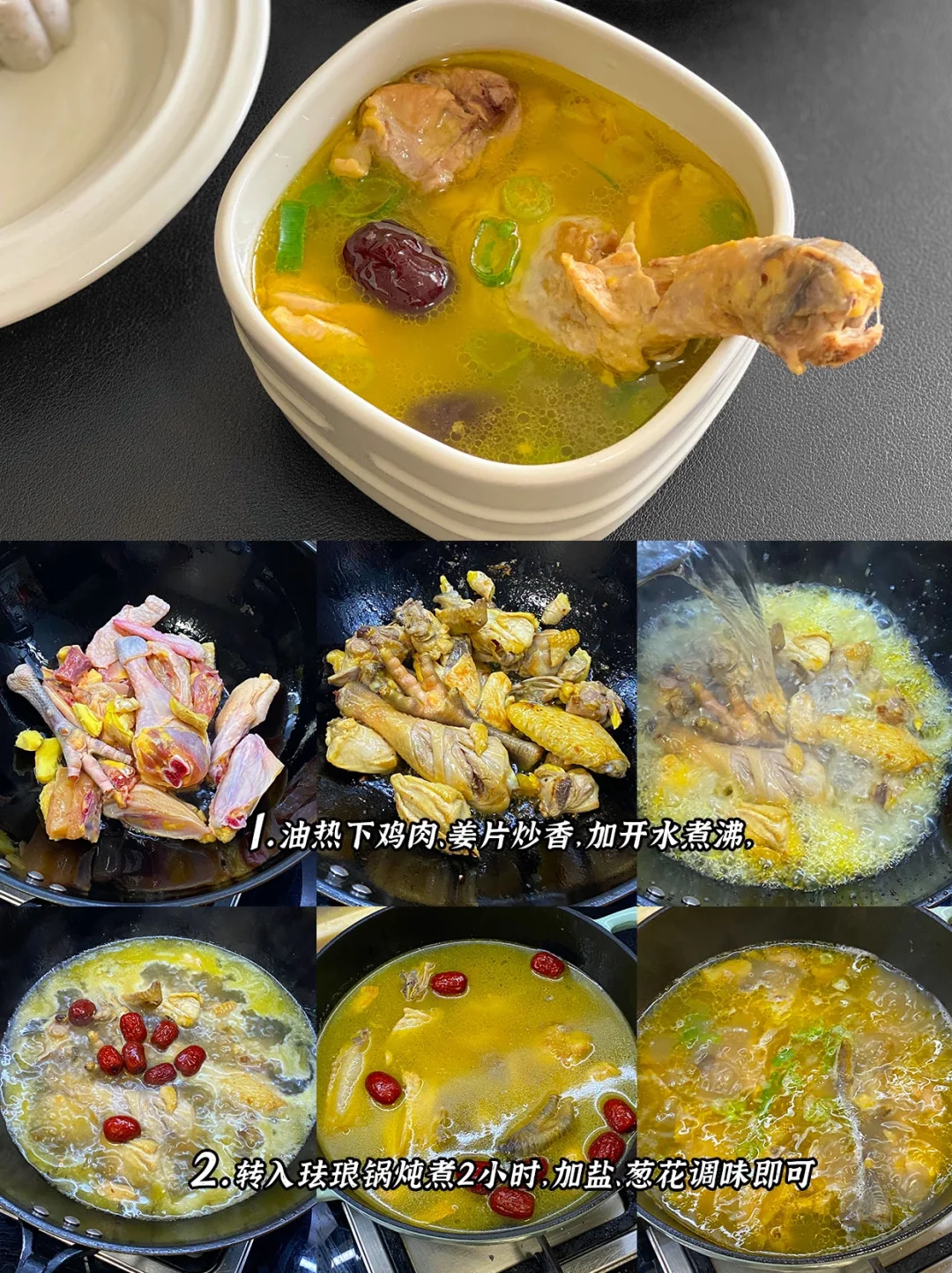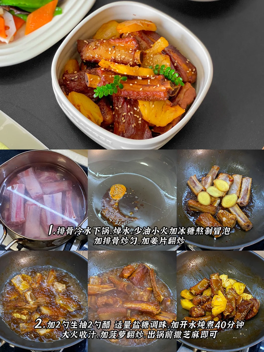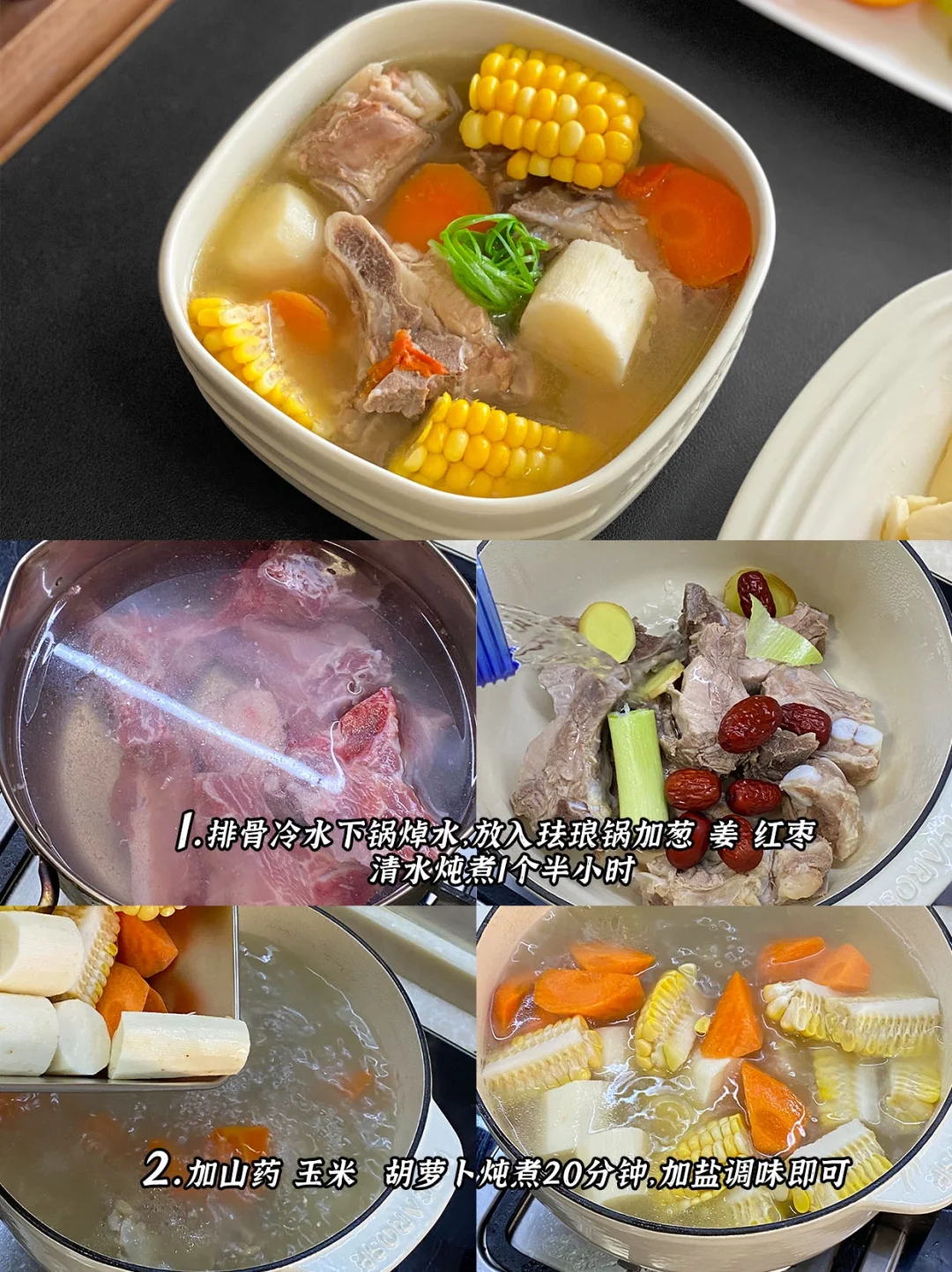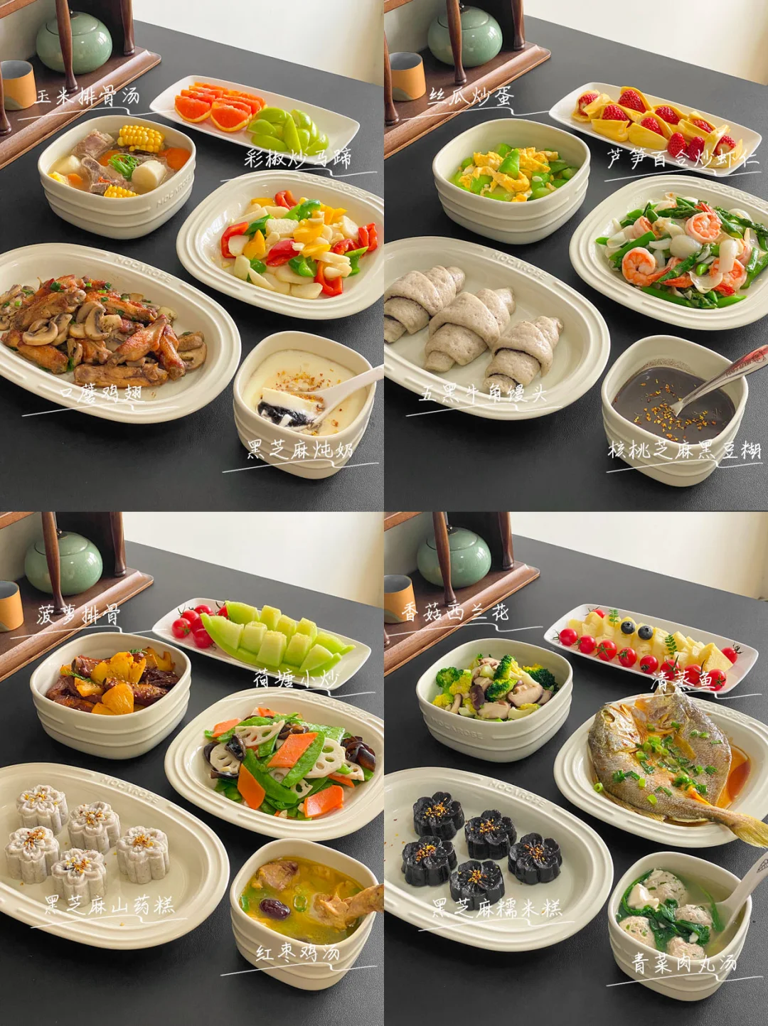 3️⃣红枣鸡汤+黑芝麻山药糕+菠萝排骨+荷塘小炒
