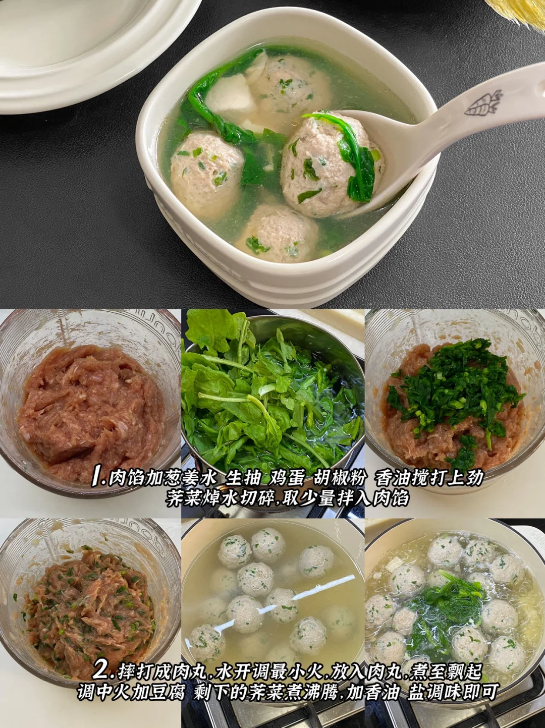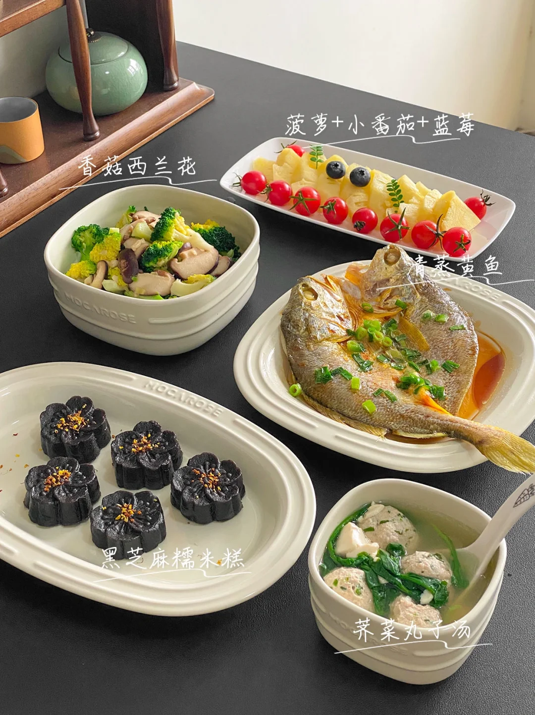 4️⃣青菜肉丸汤+黑芝麻糯米糕+清蒸鱼+香菇西兰花
