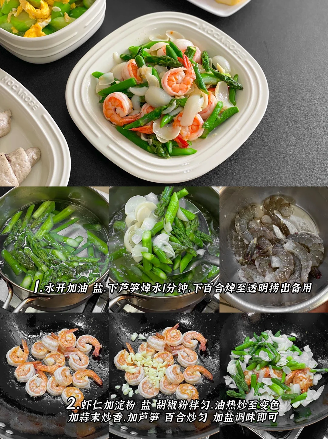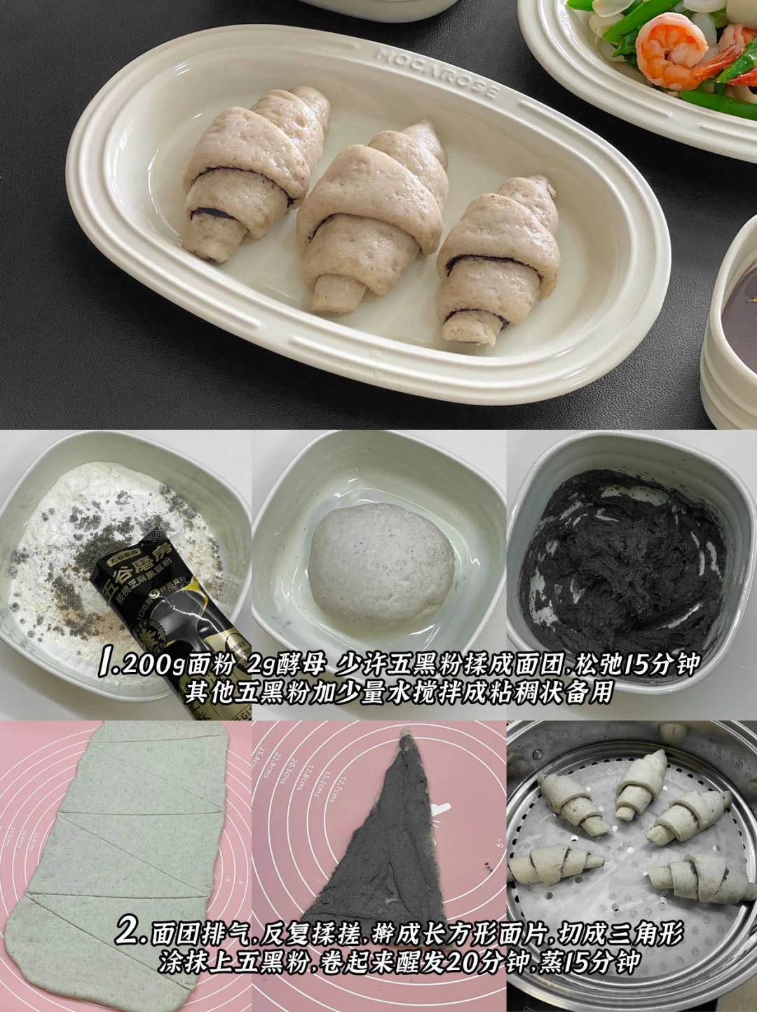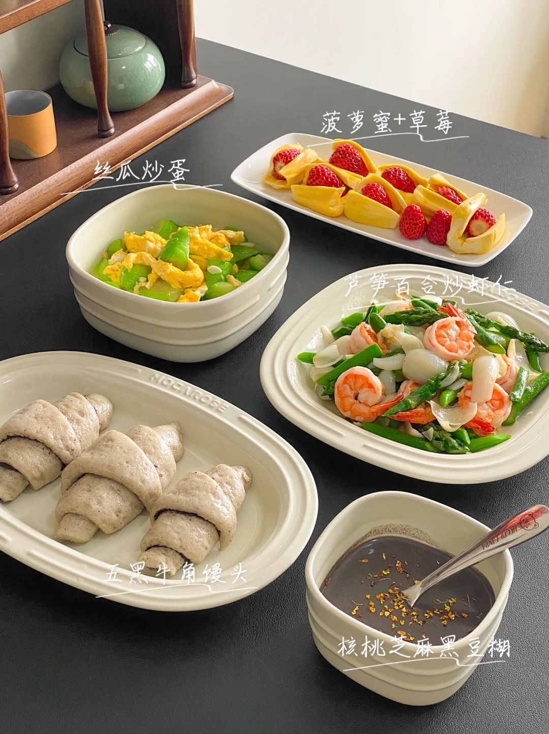 1️⃣核桃芝麻黑豆糊+黑芝麻牛角馒头+芦笋虾仁+丝瓜炒蛋