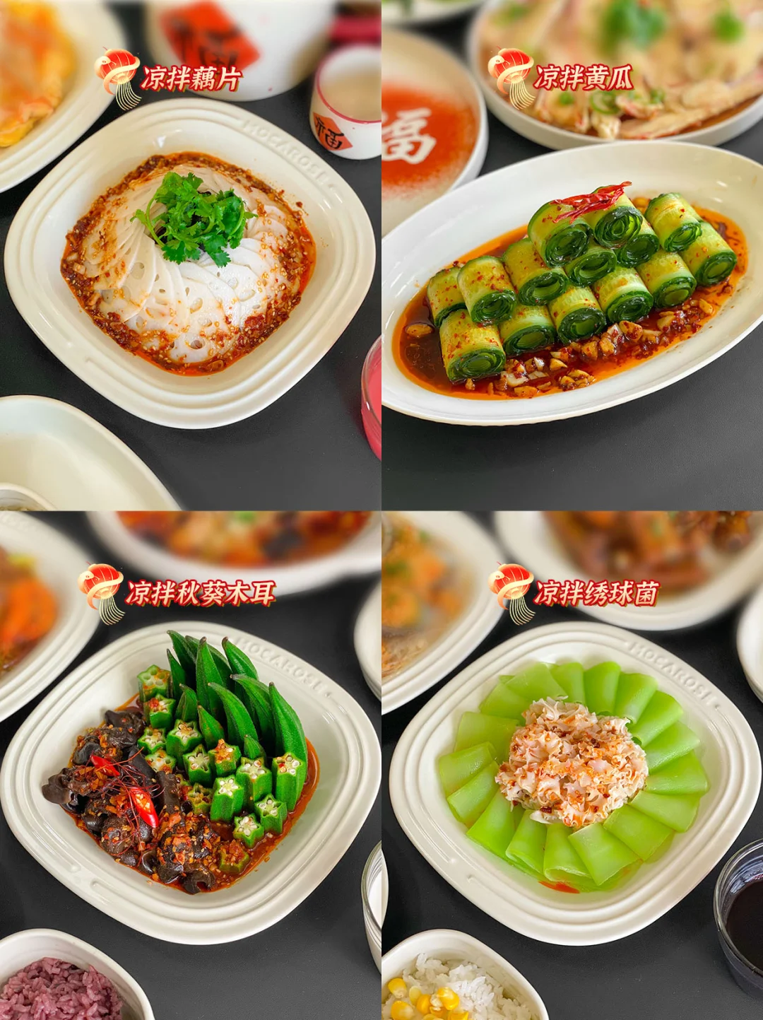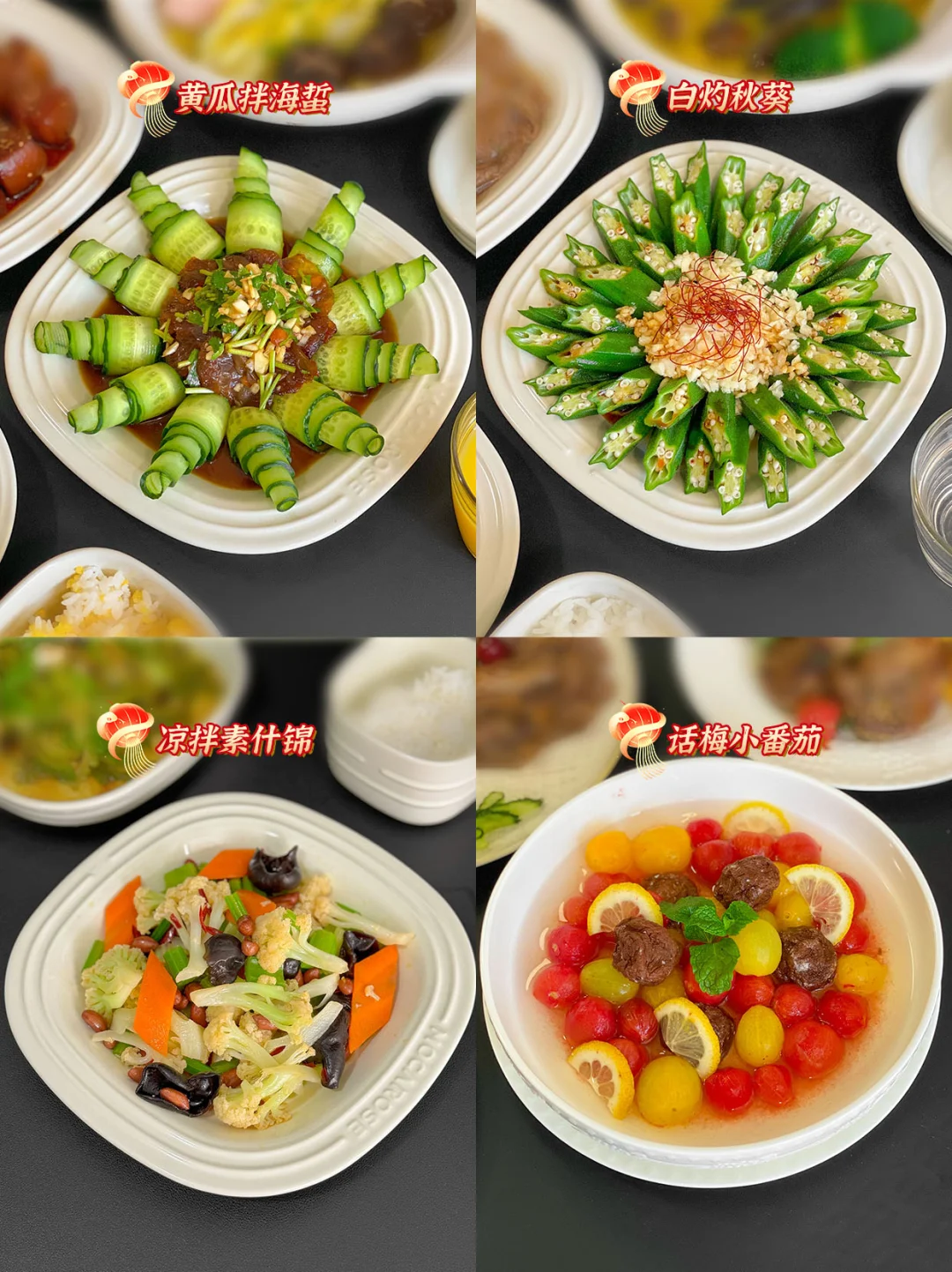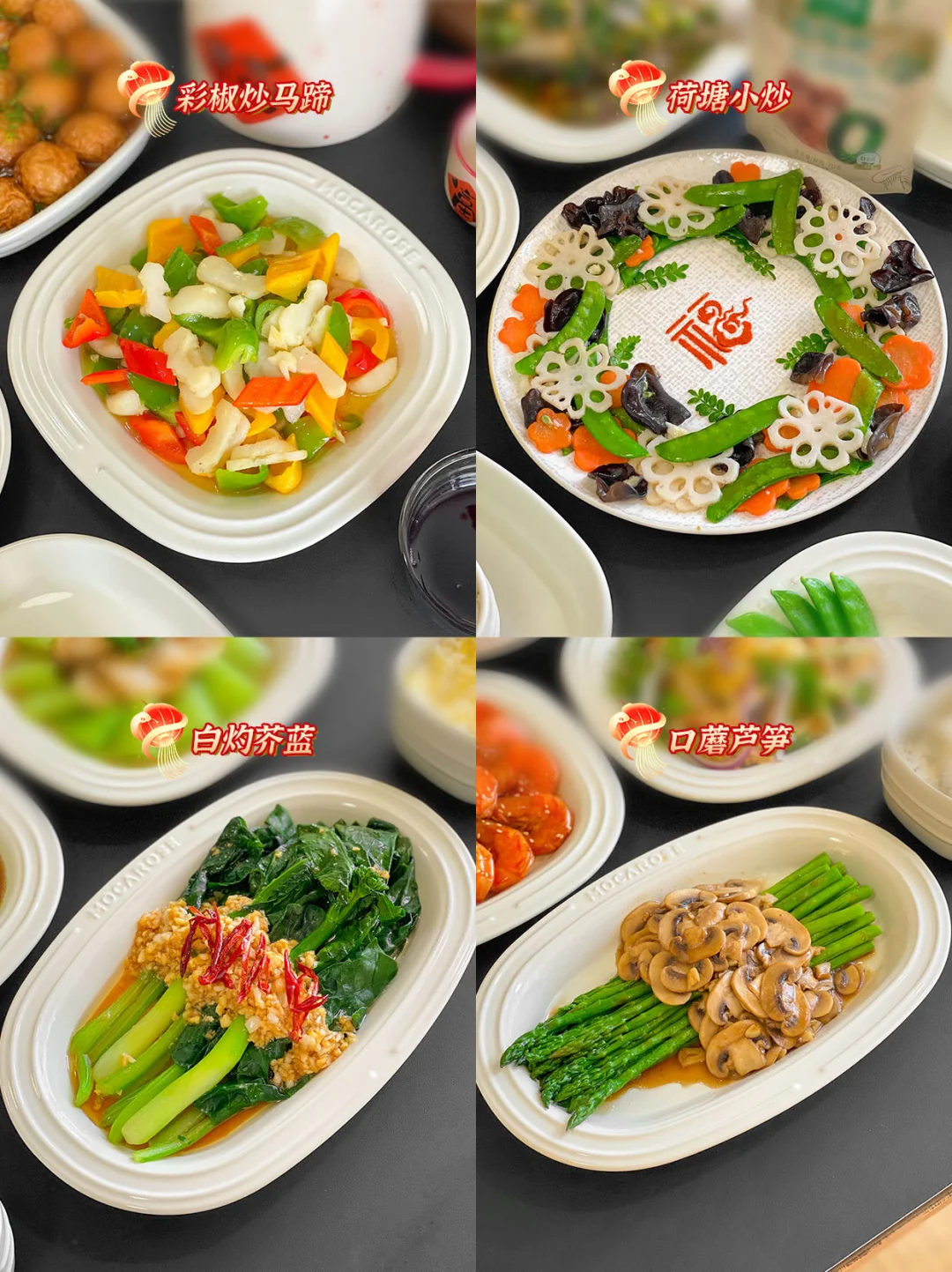 🥬1.彩椒炒马蹄、2.荷塘小炒、3.白灼芥蓝、4.口蘑芦笋、5.凉拌藕片、6.凉拌黄瓜、7.凉拌秋葵木耳、8凉拌绣球菌、9.黄瓜拌海蜇、10.白灼秋葵、11.凉拌素什锦、12.话梅小番茄