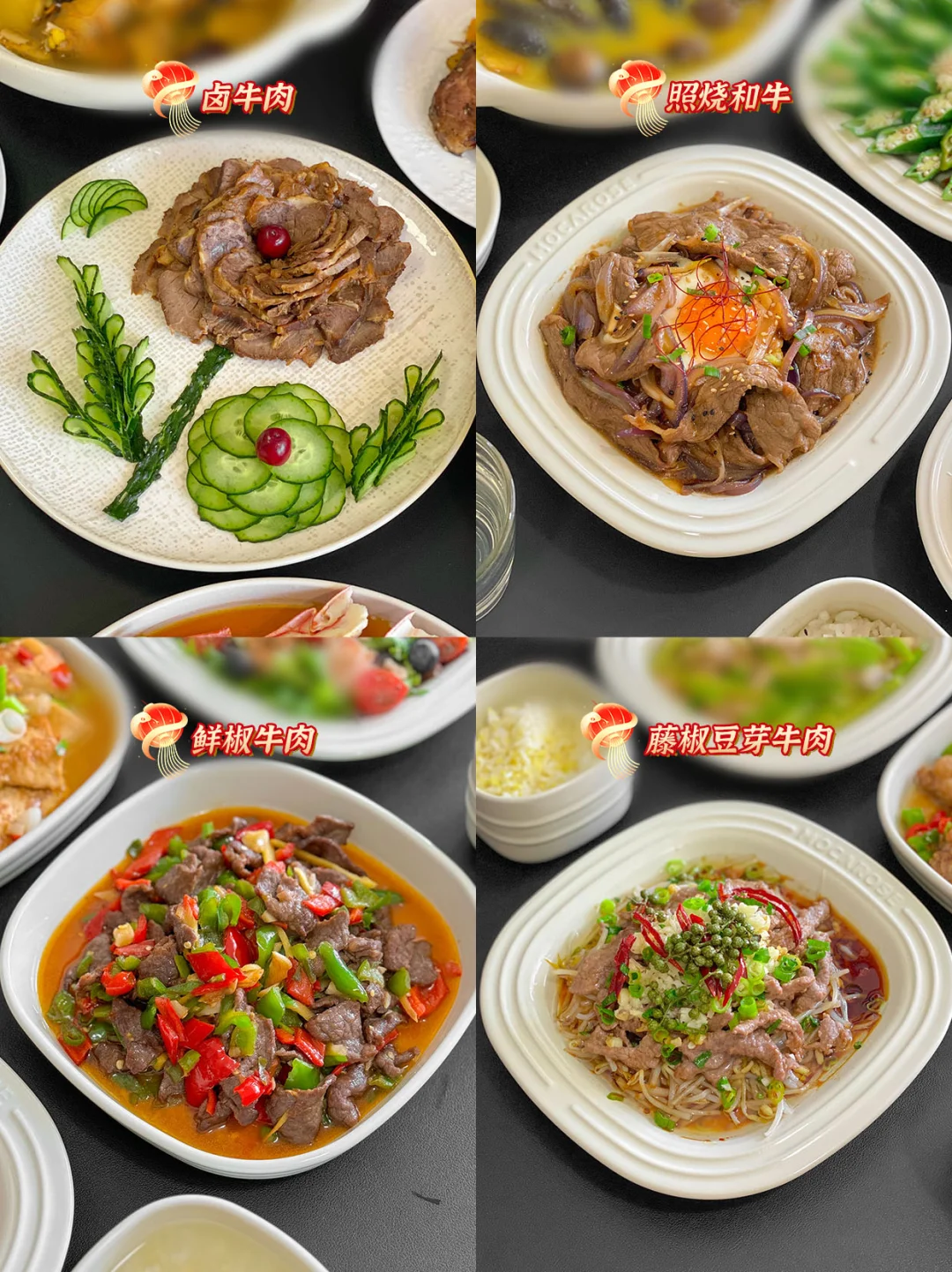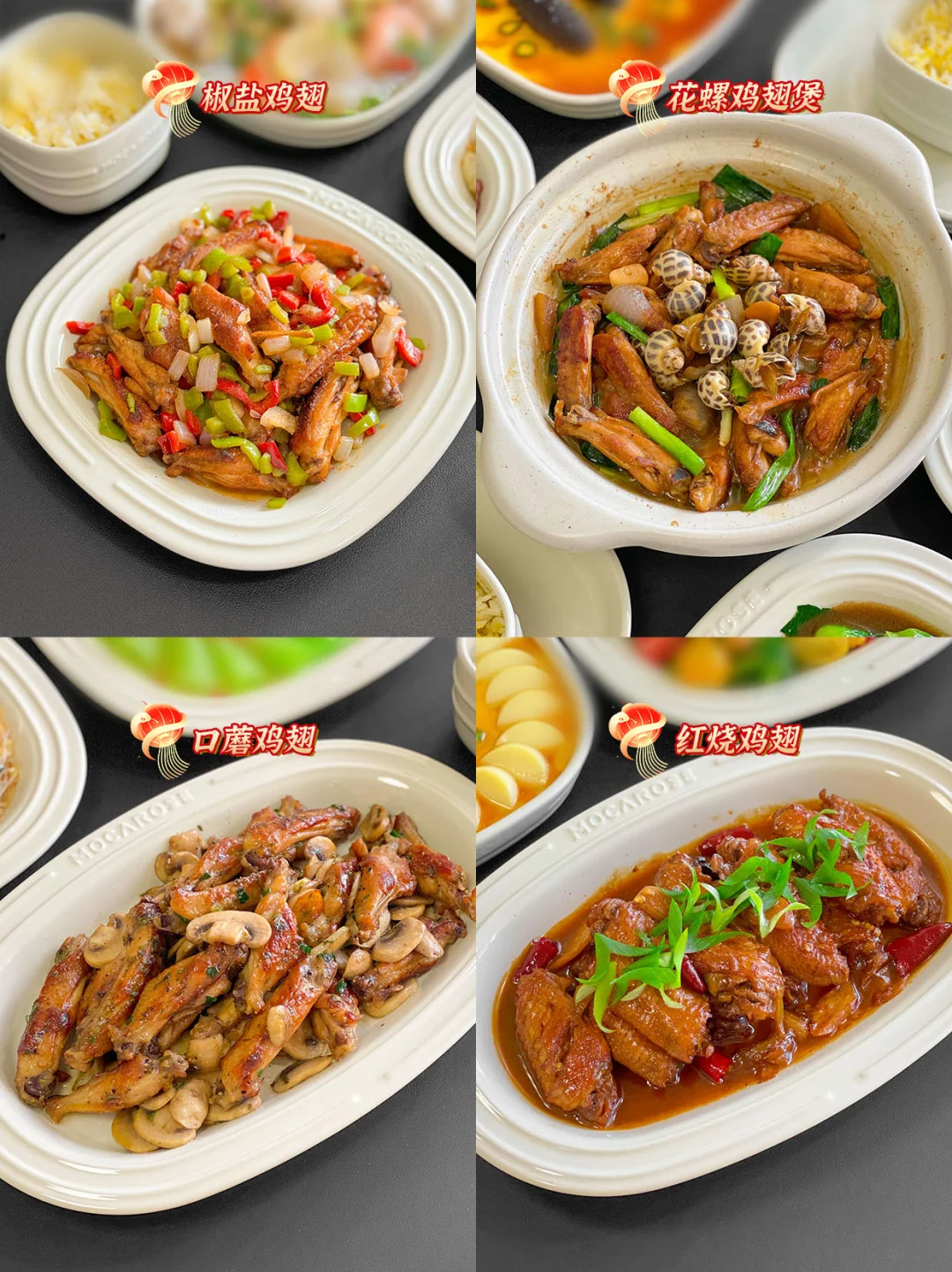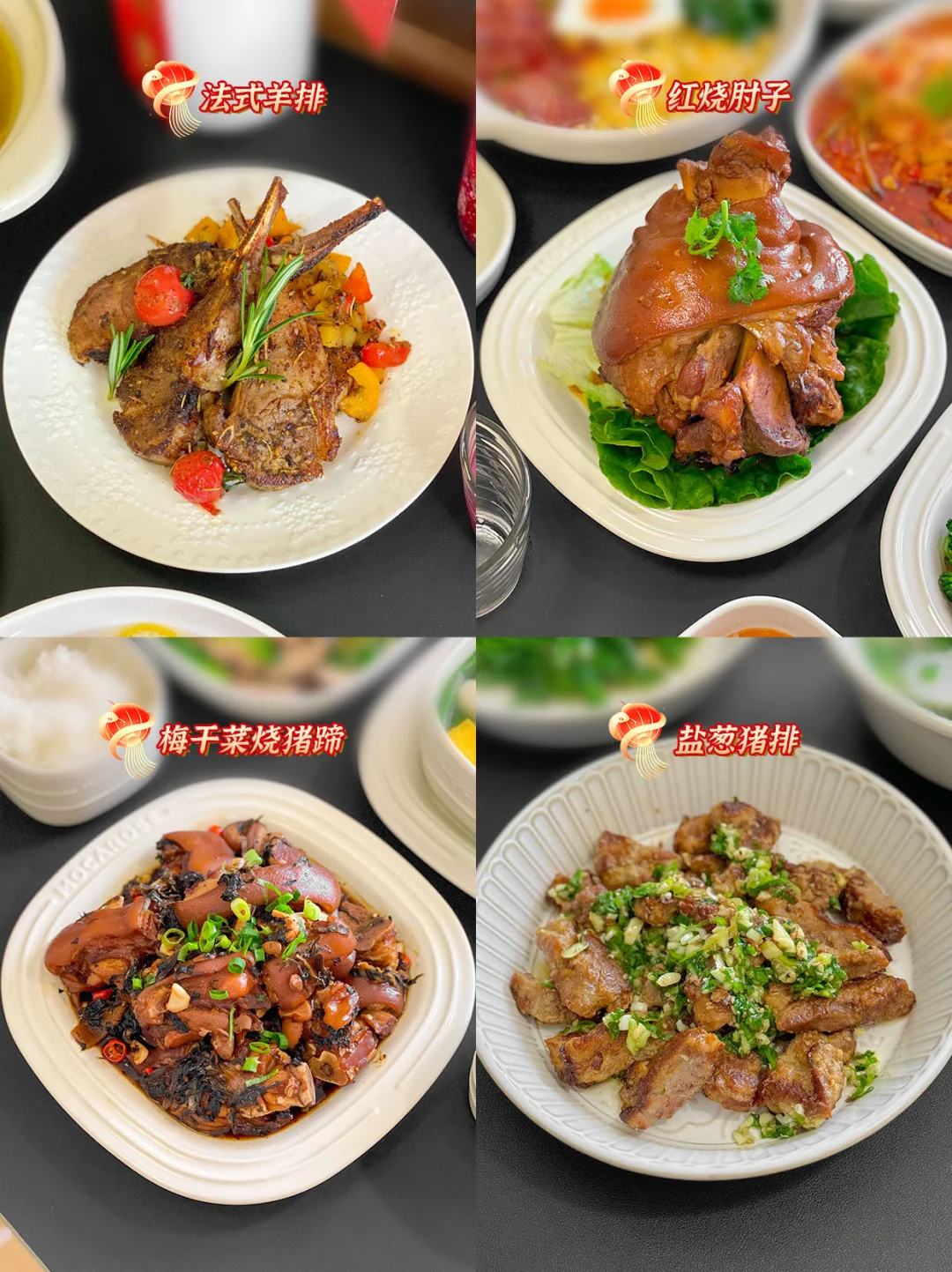 🐔🐷🐮1.椒盐鸡翅、 2.花螺鸡翅煲、3.口蘑鸡翅、4.红烧鸡翅、 5.法式羊排、6.红烧肘子、7.梅干菜烧猪蹄、8.盐葱猪排、9.豆腐酿肉、10.四喜丸子、11.白菜酿肉、12.糖醋排骨、13.卤牛肉、14.照烧和牛、15.鲜椒牛肉、16.藤椒豆芽牛肉