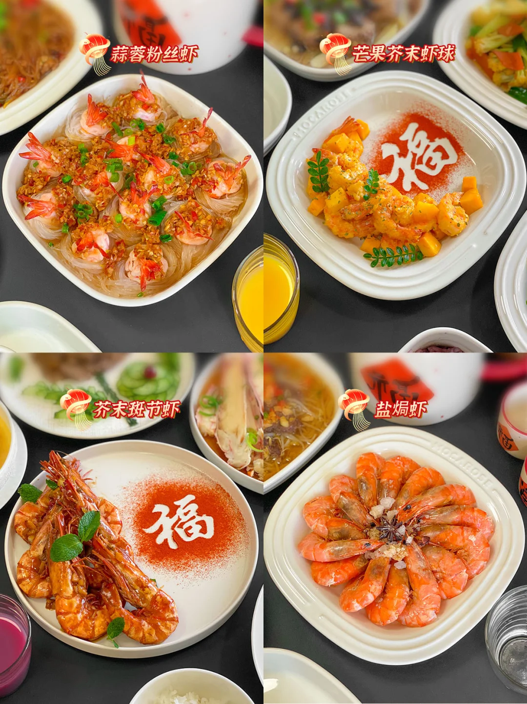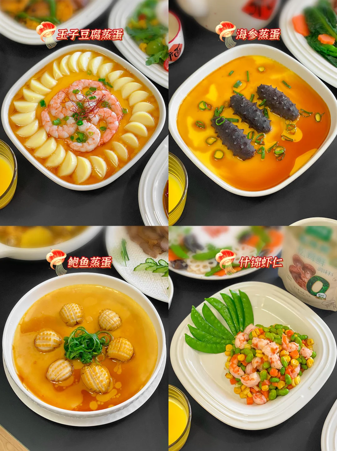 🌊🦐🐟1.葱烧海参、2.葱油鲍鱼、 3.茄汁大虾、 4.蒜蓉粉丝鲍鱼、5.蒜蓉粉丝虾、 6.芒果芥末虾球、7.芥末斑节虾、8.盐焗虾、9.香辣水煮鱼、10.红烧鲈鱼、11.葱油鲈鱼、12.清蒸鲈鱼、13.玉子豆腐蒸蛋、14.海参蒸蛋、15.鲍鱼蒸蛋、16.什锦虾仁