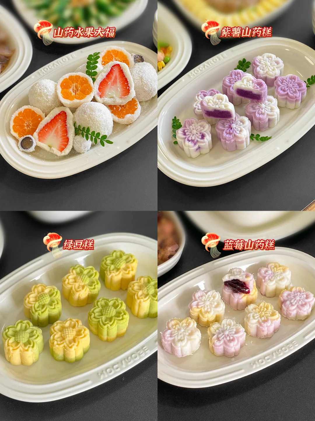 1.山药水果大福、 2.紫薯山药糕、3.绿豆糕、4.蓝莓山药糕