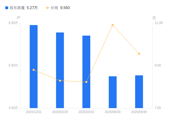 日期A股户数(户)流通A股户均持股数(股)户均持股市值(万元)2025-09-305270417295.5116.532025-06-305248217368.6718.952025-03-316205914688.3212.092025-02-286280214514.5412.032024-12-316453814124.1212.432024-09-306262814554.8713.422024-06-306519813981.1410.992024-03-316582213848.6012.372024-02-296651013705.3411.512023-12-316672113662.0012.41