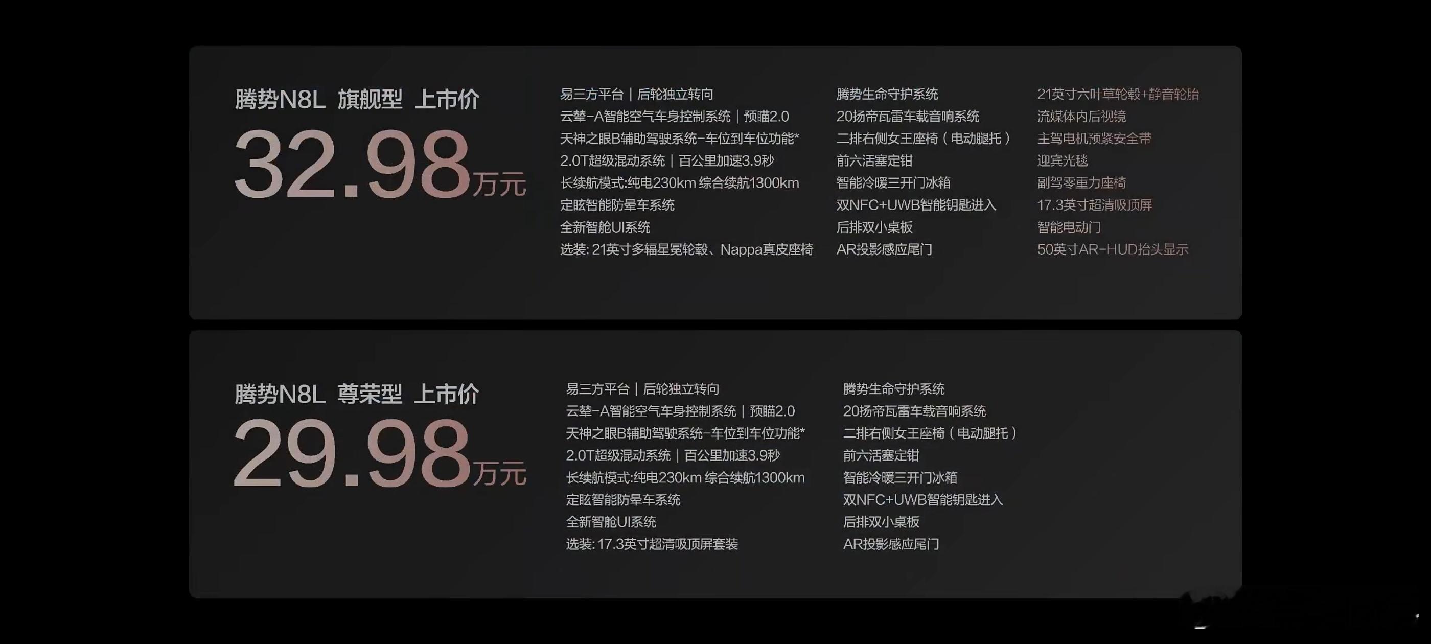 腾势 N8L 上市价格来了,2 个版本售价为 29.98 万元和 32.98 万元。