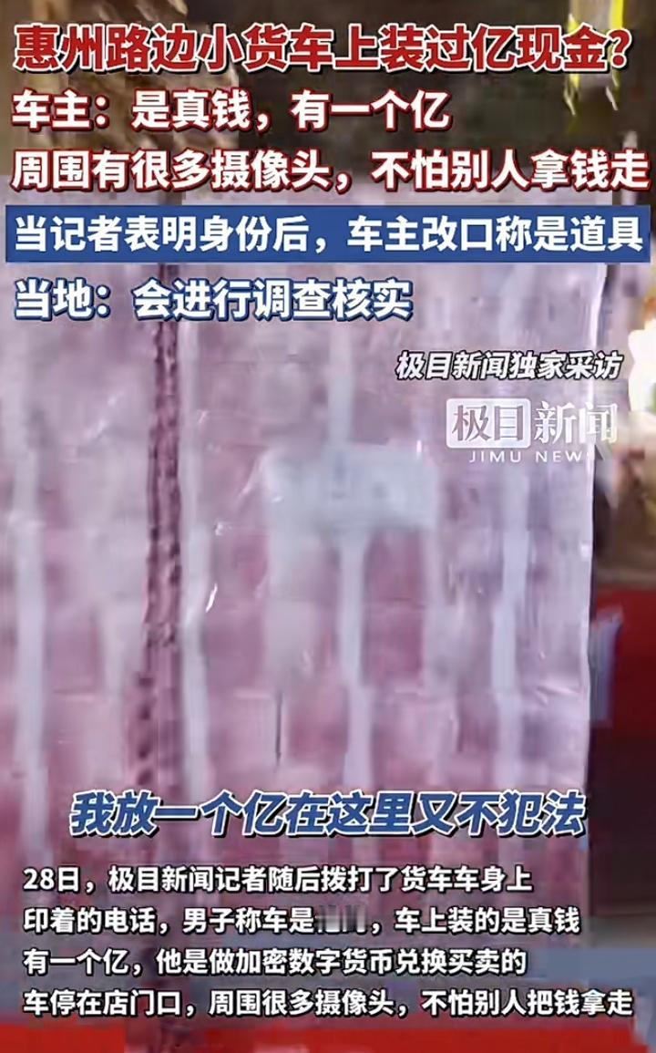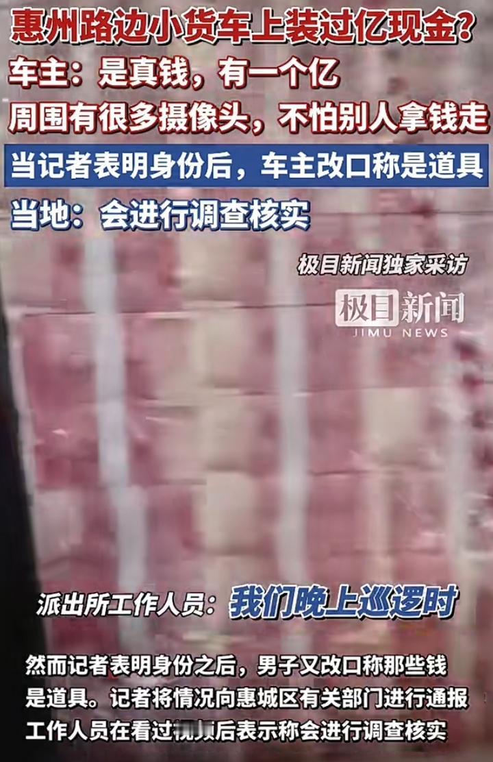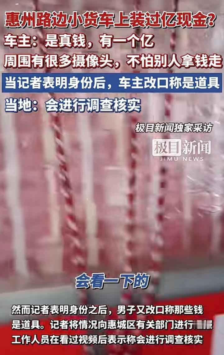 广东惠州一辆货车拉了一个亿现金放在路边,车主说就是为了显摆让别人知道他是多么的有钱,一个亿周围都是摄像头不用担心安全问题,可路人说:我是记者能清楚的看一下这些钱吗? 随后车主支支吾吾的改口说是道具没什么好看的,纯粹就是自己想显摆一下被人瞩目的时刻,那种万人敬仰羡慕掌声,是自己从小梦寐以求的,可一直没有机会实现,如今碰巧有这么一个机会,不是为了证明我多么的富有,而是告诉大家我今天依然是一条咸鱼。 随后记者把视频发给了当地相关部门,当地执法人员表示:会有巡逻车经过那里,至于真假会查清楚。 想都不用想就是道具,一个亿最起码弄个黑布盖住,用缠绕膜一缠大麻绳一绑,你以为是阳澄湖大闸蟹啊! 看过一个真的视频一个亿大约是一米高一米长一米宽,就是一个立方的面积大约就是一个亿的现金量,从视频来看他是道具的可能性非常大,要知道想调动1个亿的现金需要提前预约,甚至可以要求银行安保措施押运,从他简陋的小货车.缠绕膜.麻绳停在路边等客观与非客观因素,我也希望他是真的,最起码可以咸鱼翻身。